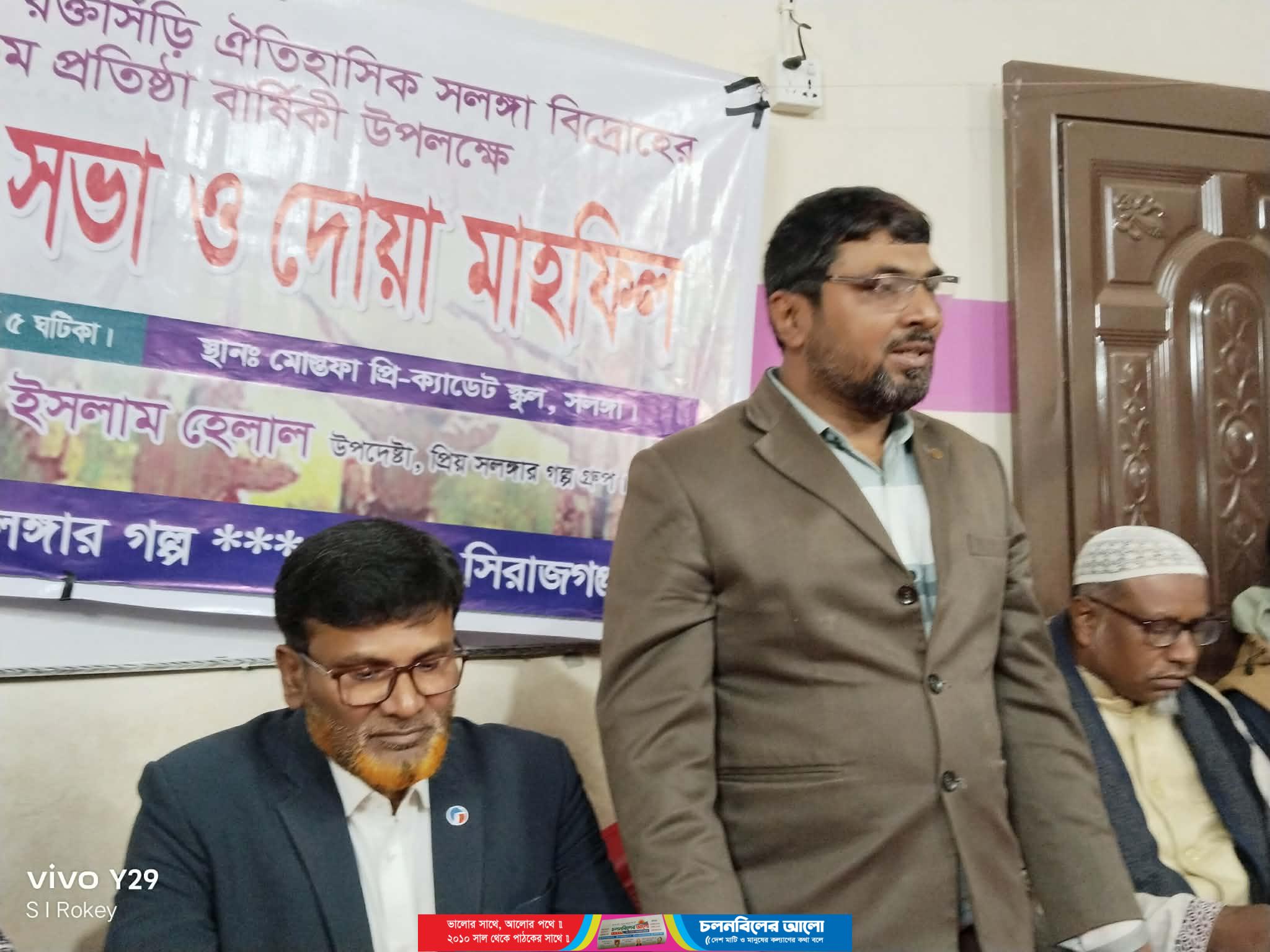 ২৭ জানুয়ারি ছিল ইতিহাসে অবিস্মরণীয় ঘটনা রক্তাক্ত সলঙ্গা বিদ্রোহ দিবস।১০৪তম দিবসটি যথাযথ মর্যাদায় পালনে “প্রিয় সলঙ্গার গল্প” সংগঠন আলোচনা সভা ও দোয়া মাহফিলের আয়োজন করে।গতকাল সন্ধ্যায় মোস্তফা প্রি-ক্যাডেট স্কুল হল রুমে আলোচনা সভায় সভাপতিত্ব করেন,কে.এম আমিনুল ইসলাম হেলাল।বক্তব্য রাখেন,এডমিন শাহ আলম,অধ্যক্ষ মোস্তফা জামান,সহকারী অধ্যাপক আব্দুল মান্নান,উপদেষ্টা বেলাল হোসেন,শিক্ষক আব্দুস ছালাম,হারুন অর রশিদ, শাহিদুল ইসলাম,নাজমুল হক,রাজু প্রমুখ।এ ছাড়াও দিবসটি পালনে সলঙ্গা সমাজ কল্যাণ,মওলানা আব্দুর রশিদ তর্কবাগিশ পাঠাগার, চড়িয়া তর্কবাগিশ বিজ্ঞান দাখিল মাদ্রাসা,পাটধারী তর্কবাগিশ উচ্চ বিদ্যালয় পৃথক পৃথক কর্মসূচী পালন করেন।
