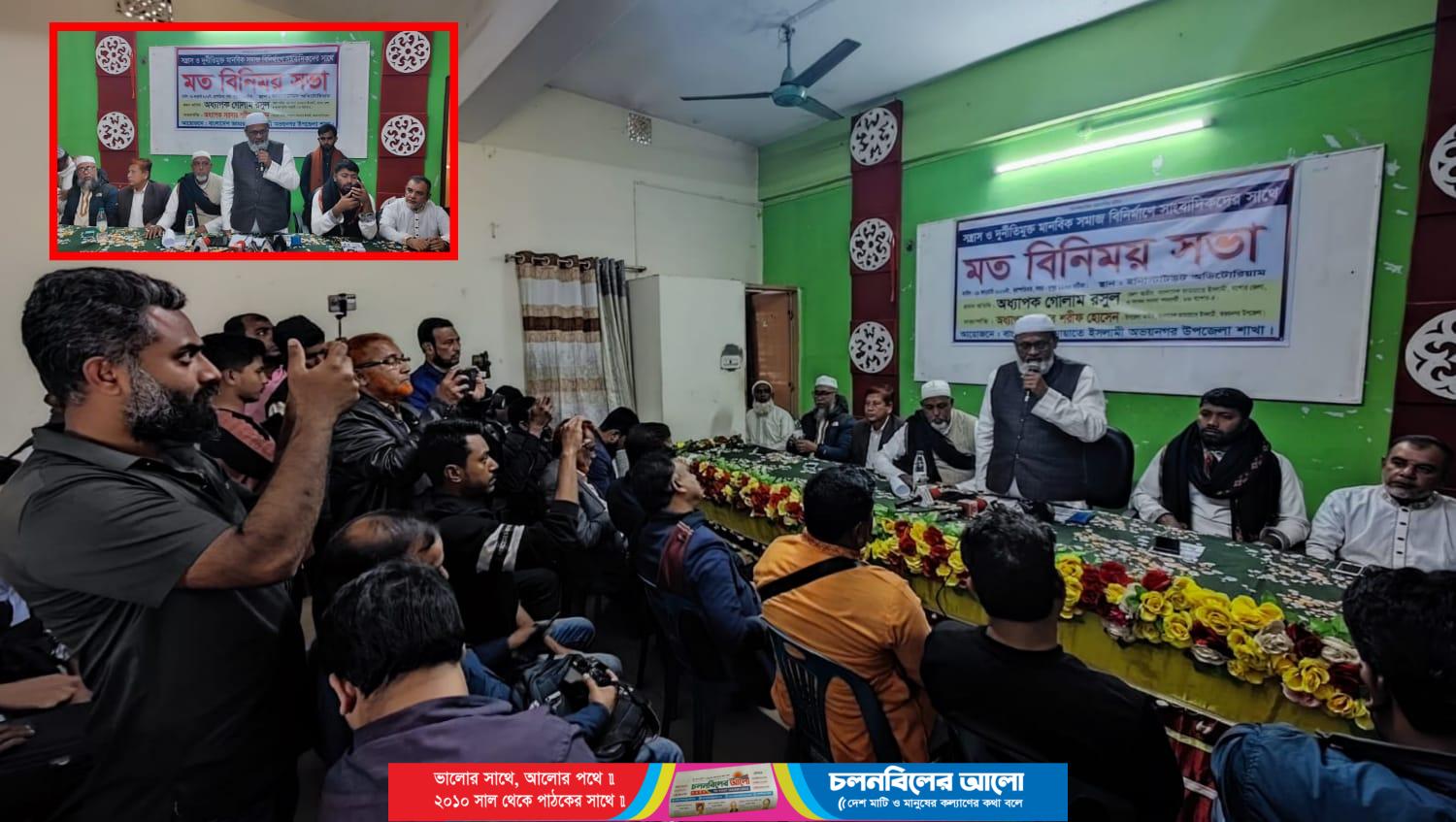 সভায় প্রধান অতিথির বক্তব্যে অধ্যাপক গোলাম রসুল বলেন, বাংলাদেশ জামায়াতে ইসলামী কখনো দুর্নীতির রাজনীতিতে বিশ্বাস করে না। অতীতে আমাদের দলের অনেক সংসদ সদস্য ও মন্ত্রী দায়িত্ব পালন করেছেন, কিন্তু তাদের বিরুদ্ধে দুর্নীতির প্রমাণ কেউ দেখাতে পারেনি। আমরা ক্ষমতার নয়, আদর্শের রাজনীতি করি। তিনি আরও বলেন, দেশ আজ দখলবাজ, চাঁদাবাজ ও সন্ত্রাসীদের কবলে পড়েছে। আমরা একটি দখলমুক্ত, চাঁদাবাজমুক্ত ও সন্ত্রাসমুক্ত বাংলাদেশ গড়তে চাই। এ ক্ষেত্রে সত্য ও বস্তুনিষ্ঠ সংবাদ পরিবেশনের মাধ্যমে সাংবাদিকদের ভূমিকা অত্যন্ত গুরুত্বপূর্ণ। মতবিনিময় সভায় সভাপতিত্ব করেন বাংলাদেশ জামায়াতে ইসলামী অভয়নগর উপজেলা শাখার আমীর অধ্যাপক সরদার শরীফ হোসেন। বিশেষ অতিথি হিসেবে বক্তব্য রাখেন উপজেলা শাখার এসিস্ট্যান্ট সেক্রেটারি গোলাম মোস্তফা। এসময় আরও উপস্থিত ছিলেন ইসলামী ছাত্রশিবির যশোর জেলা সভাপতি মোঃ আশিকুজ্জামান, জাতীয় নাগরিক পার্টি (এনসিপি) অভয়নগর উপজেলার সমন্বয়ক শাহাজান কবীর, বাংলাদেশ জামায়াতে ইসলামী নওয়াপাড়া পৌর শাখার সাংগঠনিক সম্পাদক আশিকুর ইসলামসহ জামায়াত, ইসলামী ছাত্রশিবির, এনসিপি ও অন্যান্য জোটভুক্ত দলের নেতাকর্মীরা।