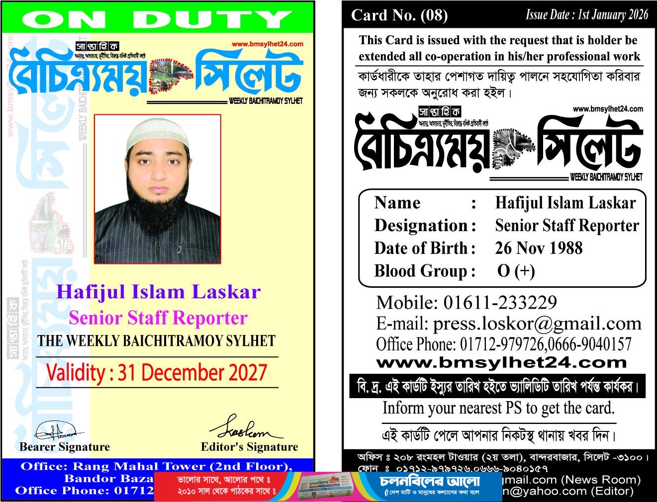 সিলেটের জনপ্রিয় সাপ্তাহিক পত্রিকা ‘বৈচিত্র্যময় সিলেট’-এর সিনিয়র স্টাফ রিপোর্টার হিসেবে নিয়োগ পেয়েছেন বিশিষ্ট কবি ও সাংবাদিক হাফিজুল ইসলাম লস্কর। গত ১ জানুয়ারি ২০২৬ থেকে তিনি আনুষ্ঠানিকভাবে পত্রিকাটিতে যোগদান করেন এবং শুক্রবার (৩০ জানুয়ারি) কর্তৃপক্ষের পক্ষ থেকে তাঁর হাতে নিয়োগপত্র ও পরিচয়পত্র তুলে দেওয়া হয়।