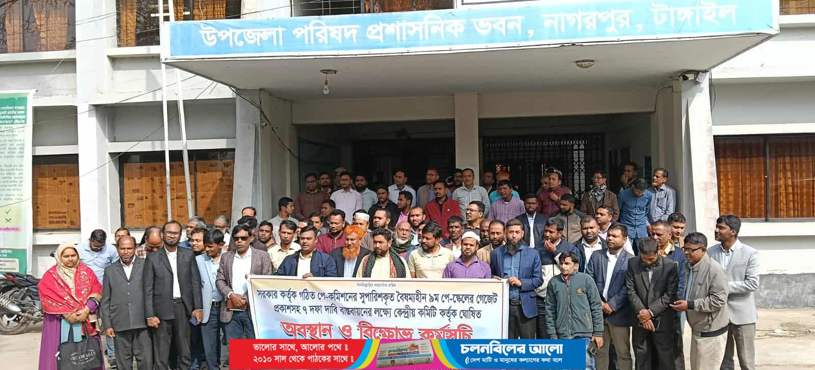 টাঙ্গাইলের নাগরপুরে সরকার কর্তৃক গঠিত পে-কমিশনের সুপারিশকৃত বৈষম্যহীন ৯ম পে- স্কেলের গেজেট প্রকাশসহ ৭ দফা বাস্তবায়নের লক্ষ্যে কেন্দ্রীয় কমিটি কর্তৃক ঘোষিত ৩র্থ ও ৪র্থ শ্রেনীর কর্মচারীদের অবস্থান ও বিক্ষোভ কর্মসূচি পালিত হয়েছে। সোমবার সকালে উপজেলা পরিষদ চত্বরে বাংলাদেশ সরকারি কর্মচারী দাবি আদায় ঐক্য পরিষদ নাগরপুর শাখার আয়োজনে কর্মসূচি অনুষ্ঠিত হয়।