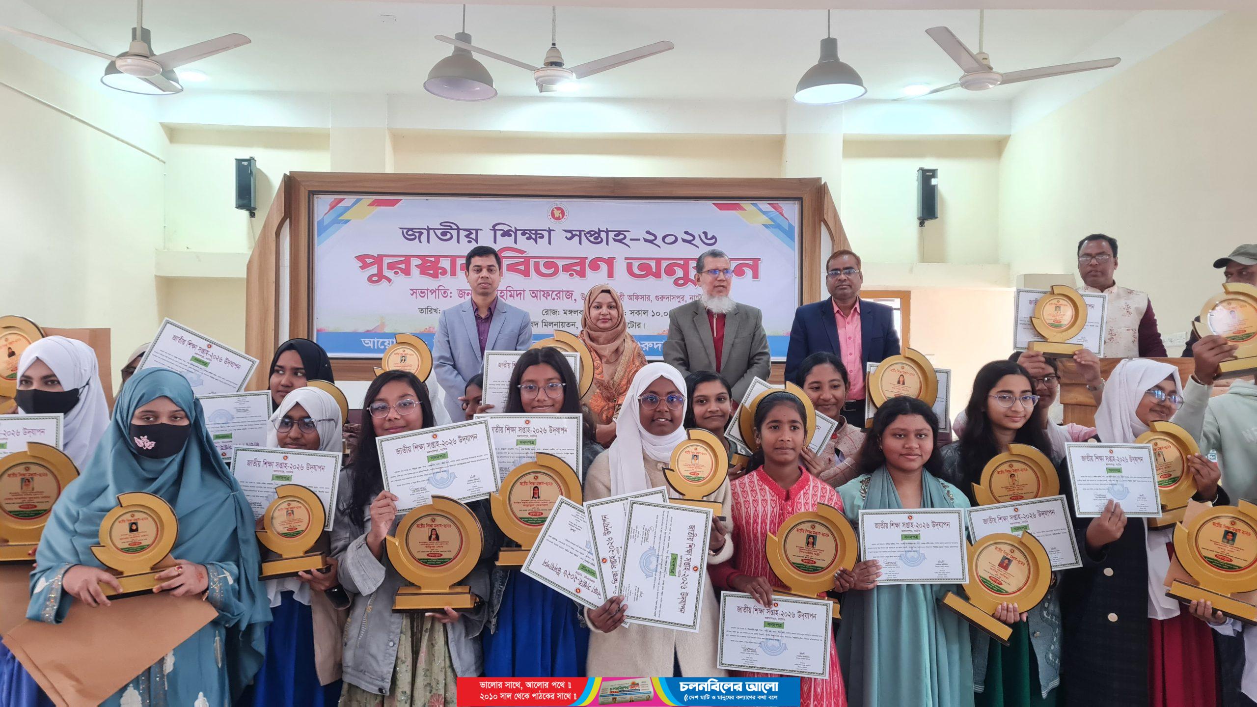জাতীয় শিক্ষা সপ্তাহ উপলক্ষে নাটোরের গুরুদাসপুরে বিজয়ী শিক্ষার্থী, শিক্ষক ও শিক্ষা প্রতিষ্ঠান প্রধানদের মাঝে পুরস্কার বিতরণ করা হয়েছে। মঙ্গলবার বেলা ১১টায় উপজেলা পরিষদ মিলনায়তনে ওই পুরস্কার বিতরণী অনুষ্ঠানে সভাপতিত্ব করেন উপজেলা নির্বাহী কর্মকর্তা (ইউএনও) ফাহমিদা আফরোজ।