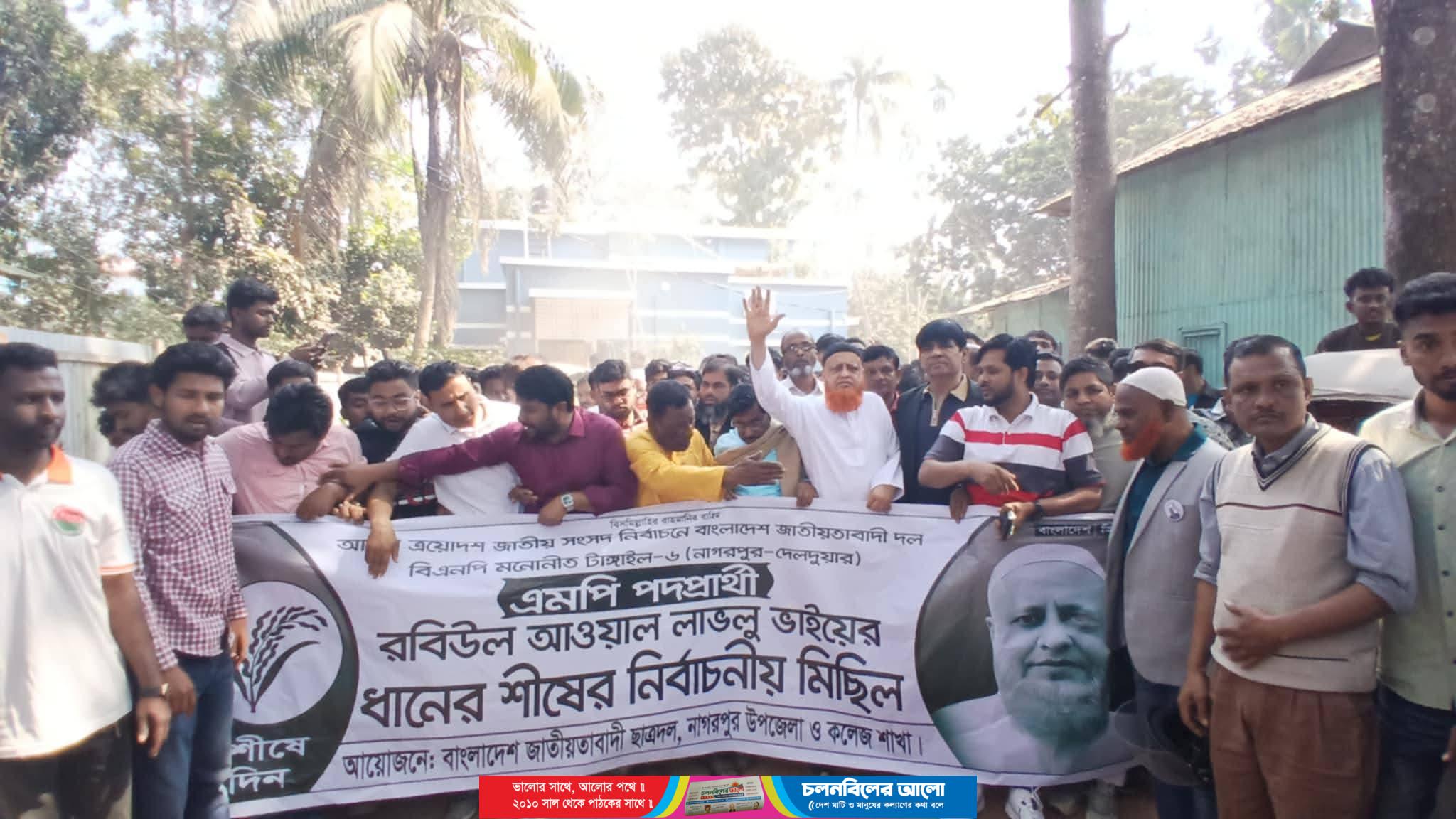ত্রয়োদশ জাতীয় সংসদ নির্বাচনে টাঙ্গাইল ৬ নাগরপুর দেলদুয়ার আসনে বিএনপির মনোনীত প্রার্থী রবিউল আওয়াল লাভলুর পক্ষে ধানের শীষ প্রতীকে বিজয়ী করতে নাগরপুর উপজেলা ছাত্রদল ও কলেজ ছাত্রদলের উদ্যোগে বিশাল একটি মিছিল বের হয়। এ  উপলক্ষে  বৃহস্পতিবার  দুপুরে নাগরপুর উপজেলা  গণমানুষের নেতা  রবিউল আওয়াল লাভলুর নিজ বাসভবন  থেকে বের হয়ে উপজেলা চত্বরসহ সদর বাজারের গুরুত্বপূর্ণ সড়ক প্রদক্ষিন করে। নেতাকর্মীদের স্বতঃস্ফূর্ত অংগ্রহণে প্রাণবন্ত হয়ে উঠে ধানের শীষের প্রচারণা র‍্যালীটি। বাংলাদেশ জাতীয়তাবাদী দল বিএনপির মনোনীত প্রার্থী নাগরপুর-দেলদুয়ার আসনে মাটি ও মানুষের নেতা রবিউল আওয়াল লাভলু উপস্থিত ছিলেন।
