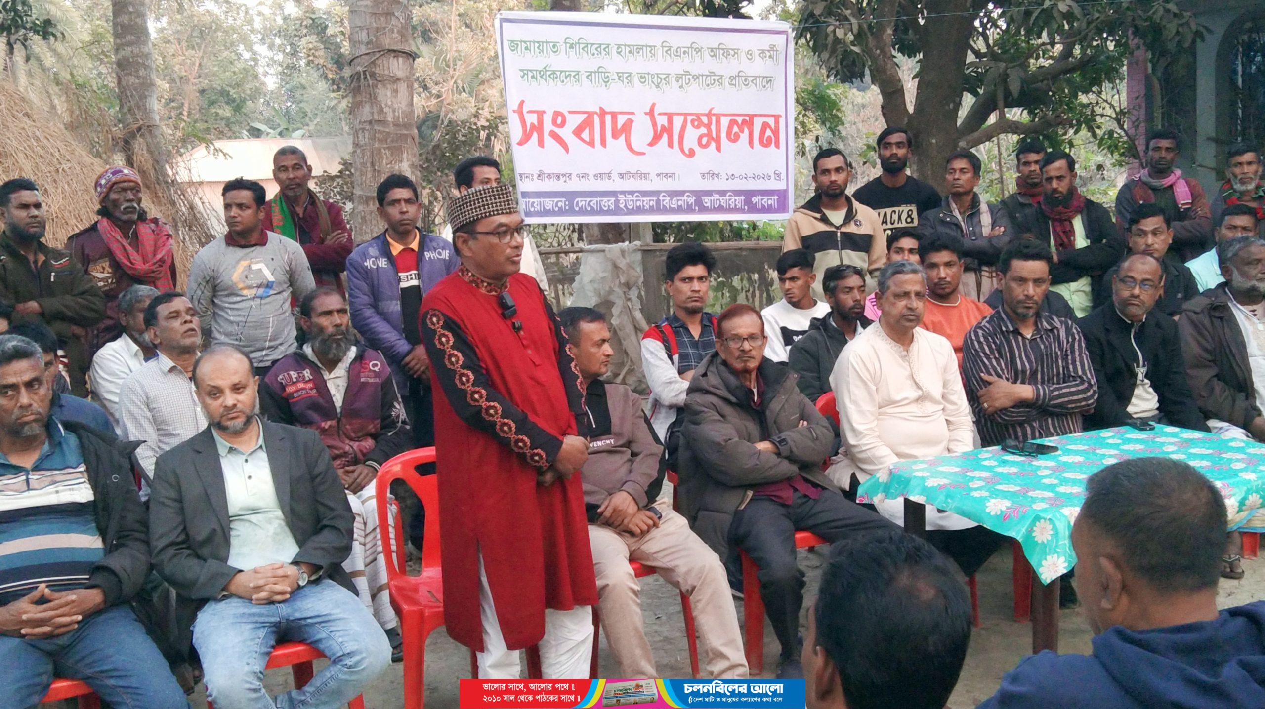 পাবনার আটঘরিয়ায় বিএনপির অফিস ভাংচুর ও এক সমর্থকদের বাড়িতে হামলা ভাংচুরের প্রতিবাদে সংবাদ সম্মেলন করেছে দেবোত্তর ইউনিয় বিএনপির নেতাকর্মীরা।