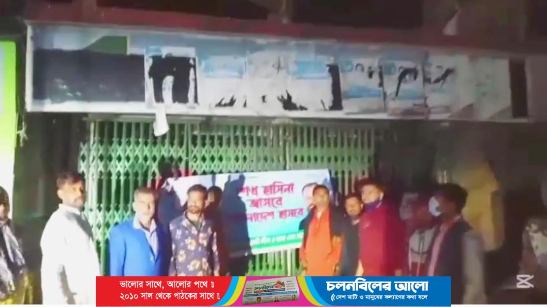 স্থানীয় সূত্রে জানা যায়, সাবেক এমপি তানভীর হাসান ছোট মনির নির্দেশনায় বৃহস্পতিবার ভোররাতে থানা আওয়ামী লীগের সাধারণ সম্পাদক সাইফুল ইসলাম সুরুজ দলীয় নেতাকর্মীদের সঙ্গে নিয়ে ব্যানার উত্তোলন করেন। ভিডিওতে দেখা যায়, মূল ফ্রেমের ওপর ব্যানার সংস্থাপন করে নেতাকর্মীরা জয় বাংলা ও জয় বঙ্গবন্ধু স্লোগান দিচ্ছেন। ভিডিওতে ৮ থেকে ১০ জনকে উপস্থিত থাকতে দেখা যায়।
