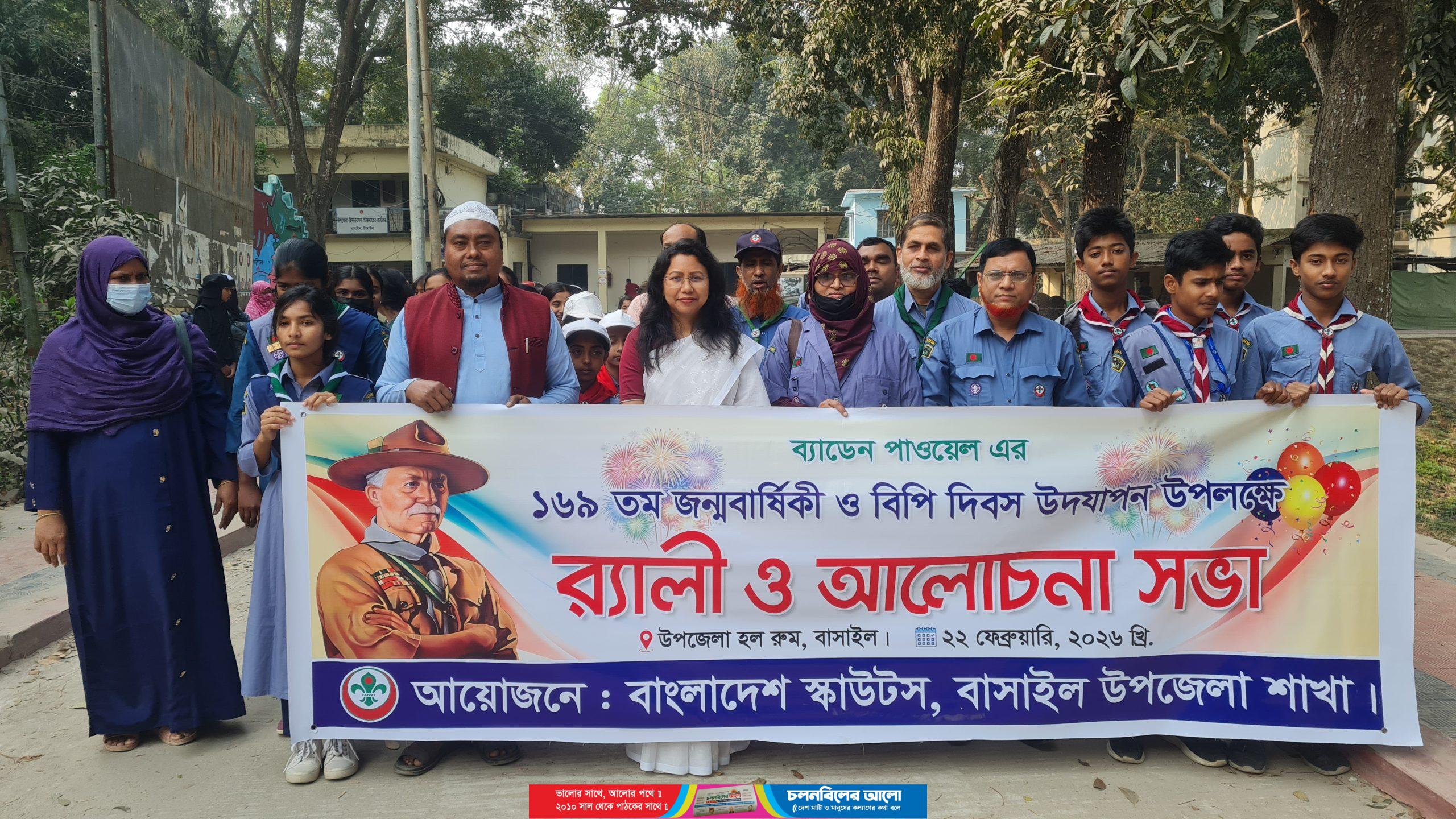 টাঙ্গাইলের বাসাইলে স্কাউটস আন্দোলনের প্রতিষ্ঠাতা লর্ড ব্যাডেন পাওয়েলের ১৬৯ তম জন্মবার্ষিকী ও বিপি দিবস উদযাপন উপলক্ষে ব্যালী ও আলোচনা সভা অনুষ্ঠিত হয়েছে। রবিবার (২২ ফেব্রুয়ারি) সকালে বাংলাদেশ স্কাউটস উপজেলা শাখার উদ্যোগে র্যালিটি বের হয়ে পৌর এলাকার গুরুত্বপূর্ণ সড়ক পদক্ষিণ করে। পরে উপজেলা পরিষদ হলরুমে আলোচনা সভার আয়োজন করা হয়।