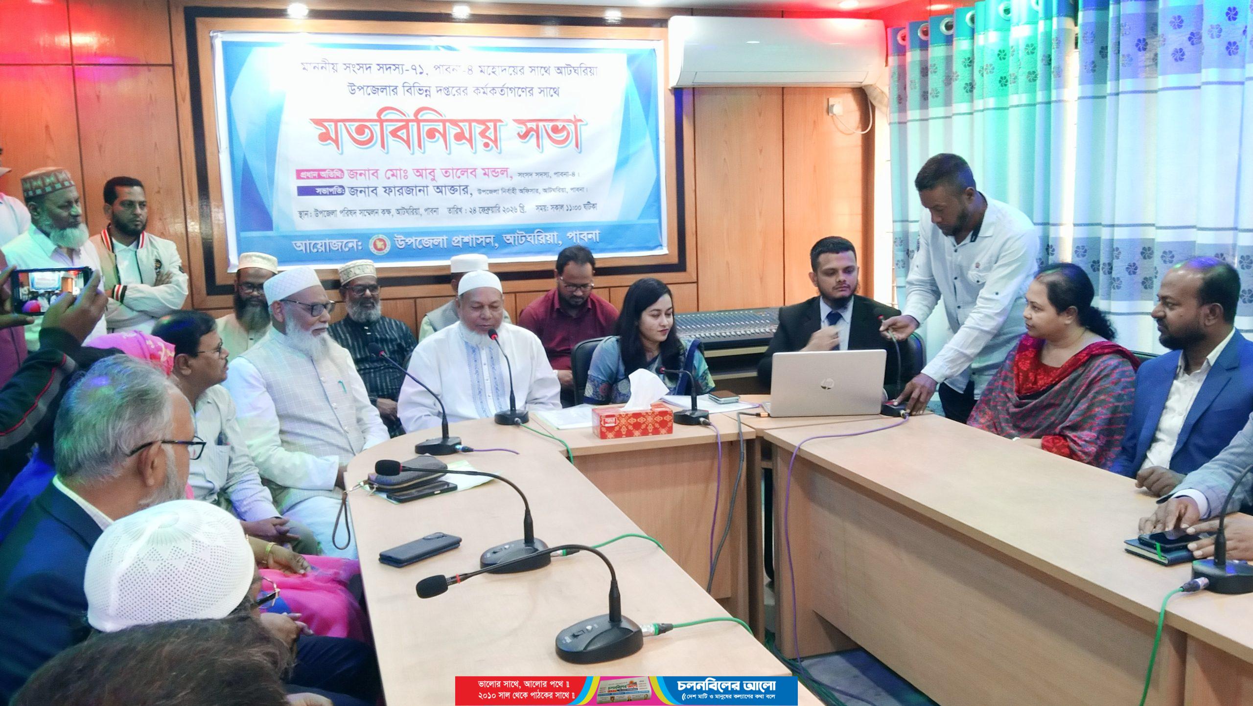 মাননীয় সংসদ সদস্য পাবনা-৪ মহোদয়ের সাথে আটঘরিয়া উপজেলার বিভিন্ন দপ্তরের কর্মকর্তাদের সাথে মতবিনিময় সভা উপজেলা সম্মেলন কক্ষে অনুষ্ঠিত হয়েছে।