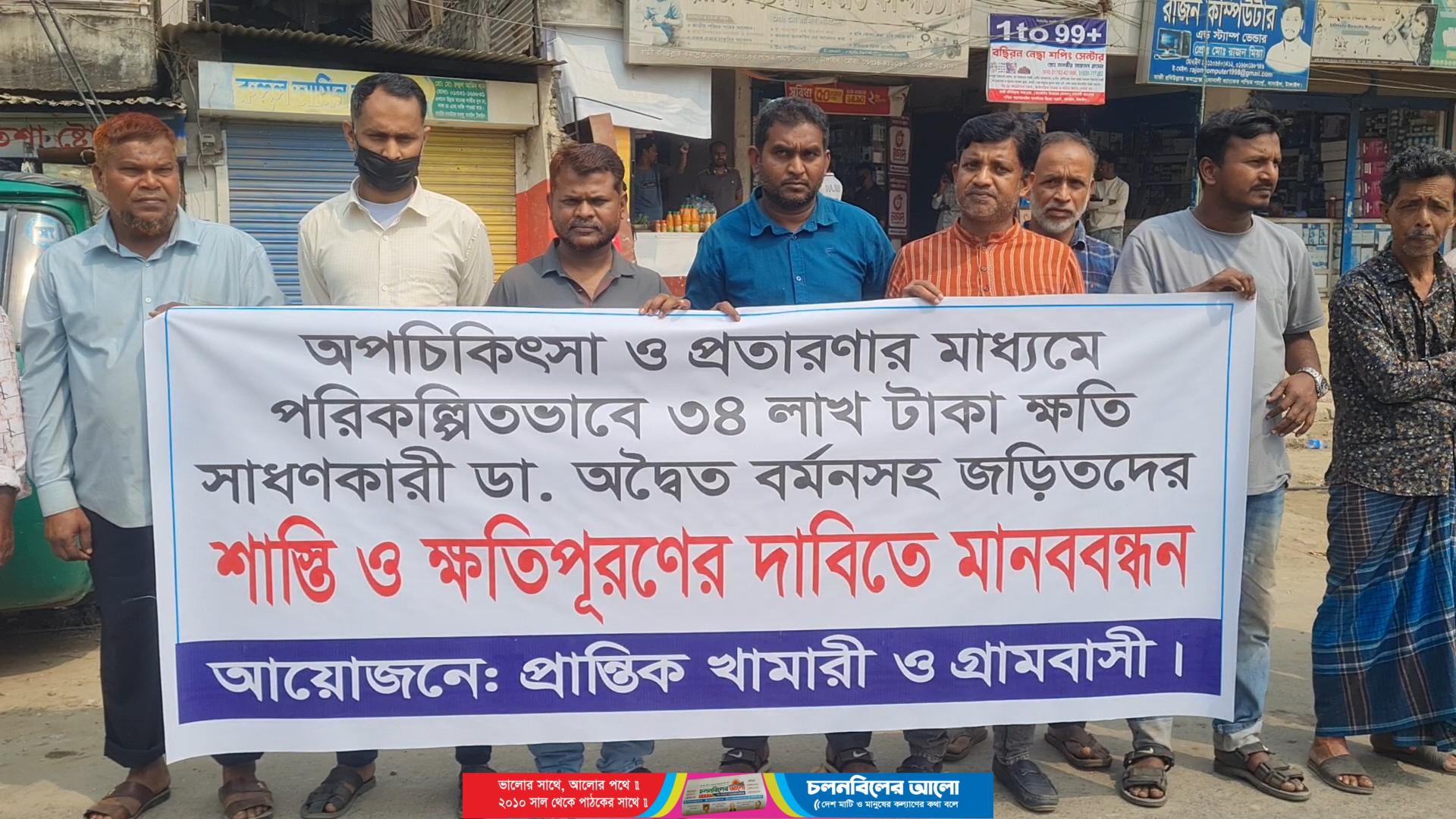 টাঙ্গাইলের বাসাইলে অপচিকিৎসা ও প্রতারণার মাধ্যমে পরিকল্পিতভাবে ১৭ হাজার মুরগি মৃত্যুর ঘটনায় ভেটেনারী ডা. অদ্বৈত বর্মন ও ডা. মেহেদী হাসানসহ জড়িতদের শাস্তি ও ক্ষতিপূরণের দাবিতে মানববন্ধন অনুষ্ঠিত হয়েছে। বুধবার (২৫ ফেব্রুয়ারি) দুপুরে বাসাইল বাসস্ট্যান্ড চত্বরে প্রান্তিক খামারি ও গ্রামবাসীর ব্যানারে এ মানববন্ধনের আয়োজন করা হয়।