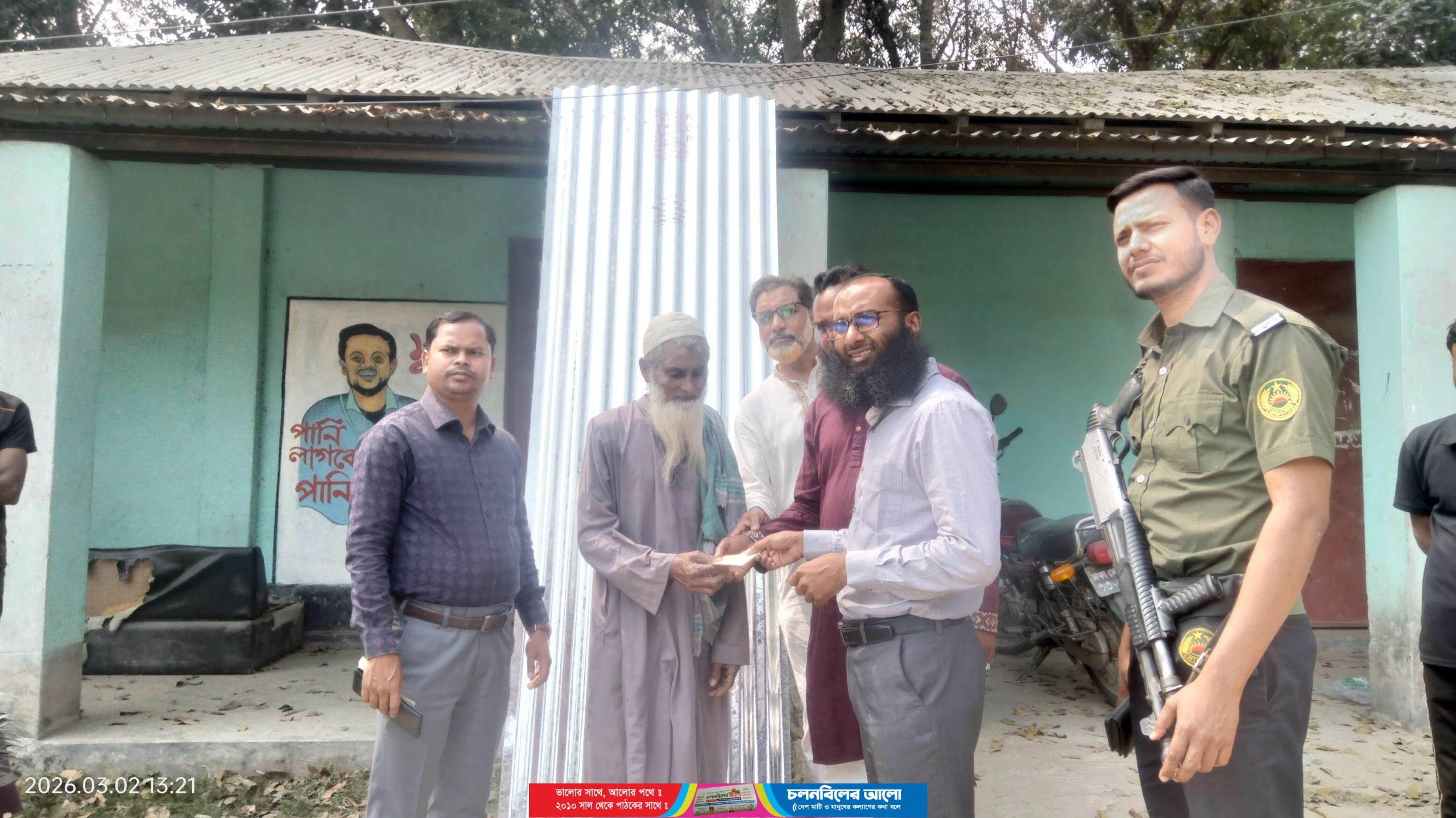 সোমবার(২ মার্চ২০২৬) দুপুরে উপজেলা প্রশাসনের পক্ষ থেকে নগদ অর্থ ও ঢেউটিন বিতরণ করেন উপজেলা নির্বাহী অফিসার( ইউএনও) এইচ.এম খোদাদাদ হোসেন। উল্লেখ্য,যমুনা বিধৌত সিরাজগঞ্জের চৌহালী উপজেলার যমুনা নদীর চরাচঞ্চল হাটাইল গ্রামের শওকত হোসেন ও আসাদের বাড়িতে ভয়াবহ অগ্নিকাণ্ডের ঘটনা ঘটেছিল । স্থানীয় প্রত্যক্ষদর্শীরা জানান, প্রাথমিকভাবে প্রায় ৮লাখ টাকার ক্ষয়ক্ষতির আশঙ্কা করা হচ্ছে। এদিকে উপজেলা প্রশাসন ঘটনাস্থল পরিদর্শন করেন এবং দুই পরিবারের হাতে নগদ অর্থ, দুই বান করে ঢেউটিন, শুকনা খাবার ও কিছু কম্বল প্রদান করা হয়। পাশাপাশি পরিবারটির পুনর্বাসনে প্রয়োজনীয় সহায়তা অব্যাহত থাকবে বলে আশ্বাস দেন ইউএনও। এসময় উপজেলা প্রকল্প বাস্তবায়ন অফিসার পিআইও হেকমত আলী, উমারপুর ইউনিয়নের প্যানেল চেয়ারম্যান কামরুজ্জামান মন্ডল, খাষকাউলিয়া ইউপির সাবেক চেয়ারম্যান শহিদুর রহমান শহিদ, পিআইও অফিসের মেহেদী হাসান ও সিএ ইউসুফ আলী প্রমুখ উপস্থিত ছিলেন।