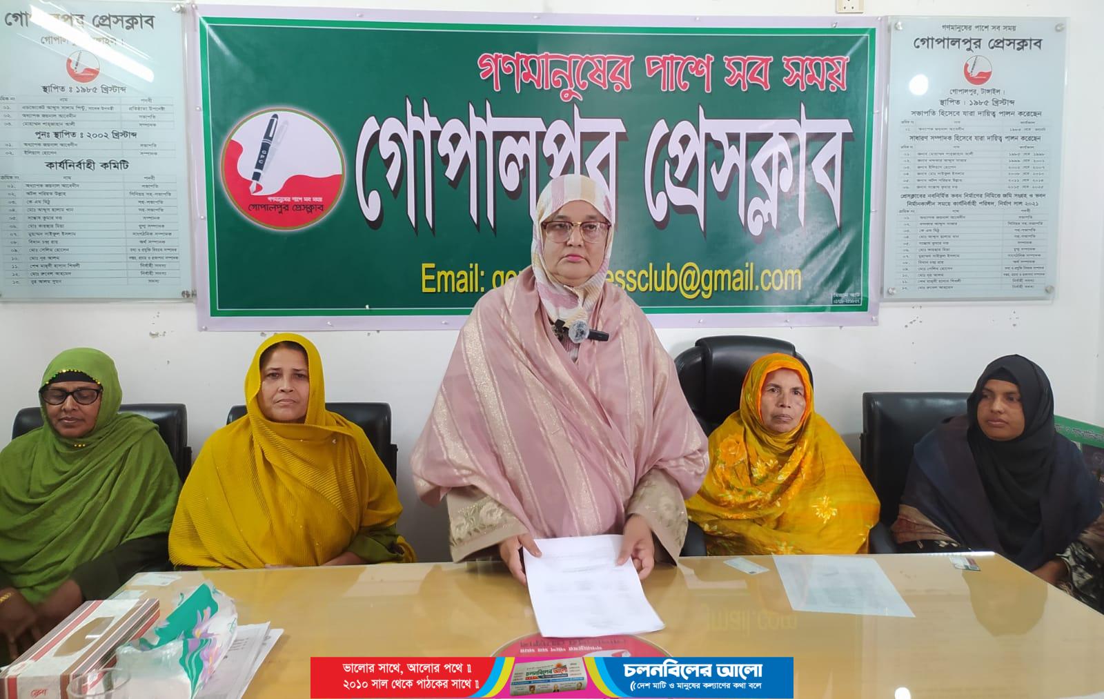 এ সময় উপস্থিত ছিলেন গোপালপুর উপজেলা দলের সম্পাদক মমতাজ, সহ-সভাপতি ফরিদা বেগম, পৌর মহিলা দলের সভাপতি মমতাজ বেগম, সহ-সভাপতি লাবনীসহ মহিলা দলের অন্যান্য নেতৃবৃন্দ।