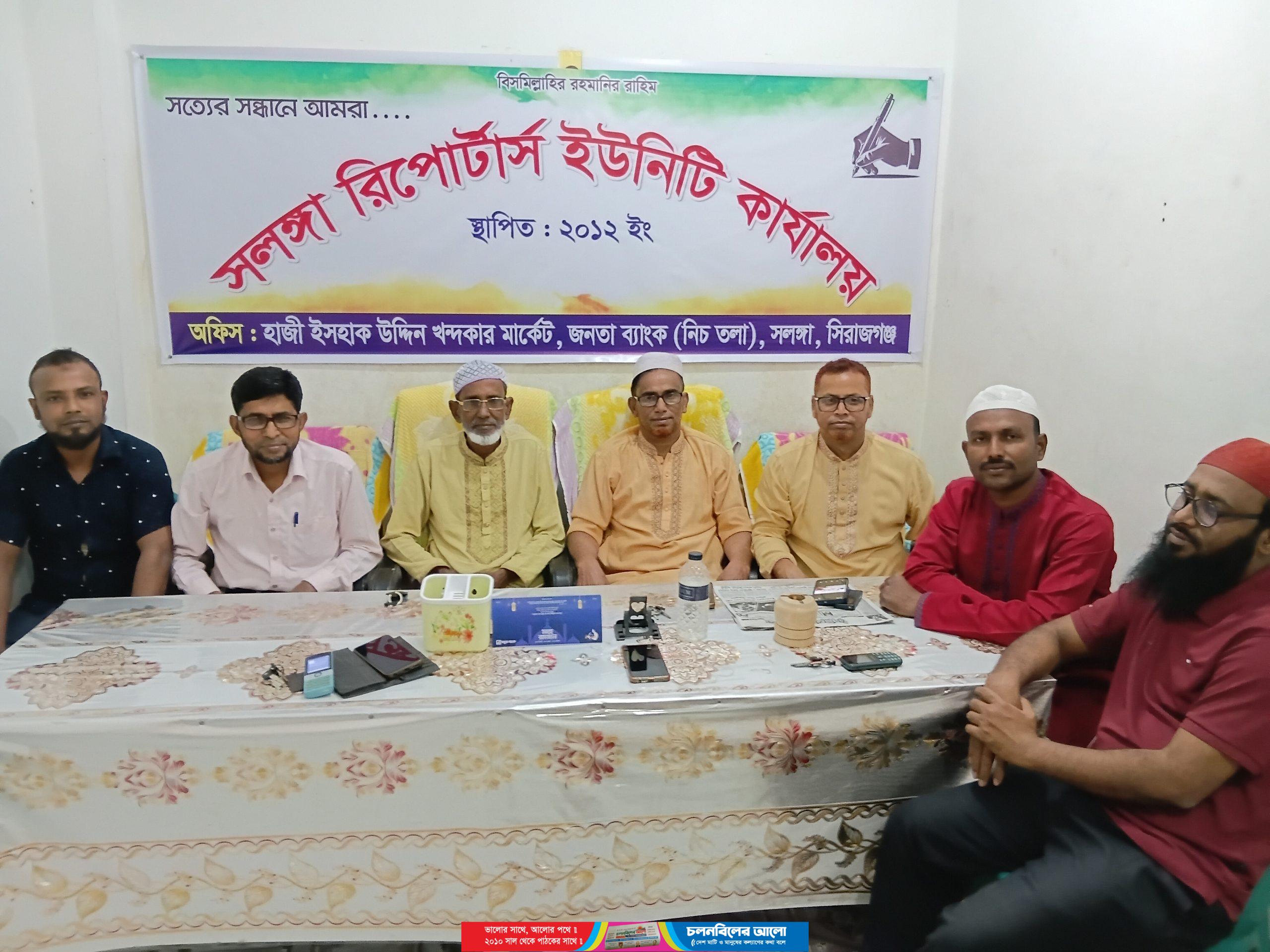 সিরাজগঞ্জের “সলঙ্গা রিপোর্টার্স ইউনিটি”র উদ্যোগে এক ইফতার ও দোয়া মাহফিল অনুষ্ঠিত হয়েছে।গতকাল শুক্রবার বাদ আছর সলঙ্গা বাজারের হাজী ইসহাক আলী মার্কেটে সংগঠনের অস্থায়ী কার্যালয়ে এ আয়োজন করা হয়।