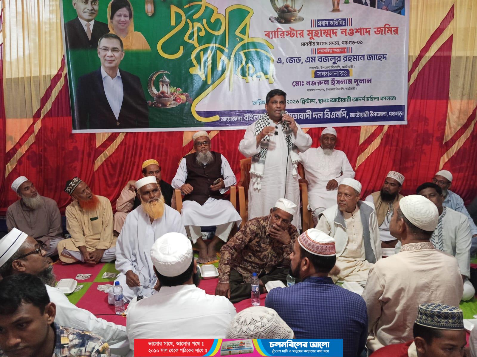 পঞ্চগড়ের আটোয়ারীতে বাংলাদেশ জাতীয়তাবাদী দল আটোয়ারী উপজেলা শাখার উদ্যোগে আলোচনা সভা ও ইফতার মাহফিল অনুষ্ঠিত হয়েছে। সোমবার ( ৯ মার্চ) বিকেলে আটোয়ারী আদর্শ মহিলা ডিগ্রি কলেজ মাঠে এই অনুষ্ঠানের আয়োজন করা হয়। উপজেলা বিএনপি আয়োজিত এই অনুষ্ঠানে প্রধান অতিথি হিসেবে উপস্থিত ছিলেন পঞ্চগড় -১ আসনের নবনির্বাচিত জাতীয় সংসদ সদস্য ব্যারিষ্টার মুহাম্মদ নওশাদ জমির। উপজেলা বিএনপি’র সভাপতি এ.জেড.এম বজলুর রহমান (জাহেদ) এর সভাপতিত্বে এবং সাধারণ সম্পাদক মোঃ নজরুল ইসলাম দুলাল এর সঞ্চালনায় আলোচনা সভা অনুষ্ঠিত হয়। ইফতার মাহফিলে জেলা বিএনপি’র নেতৃবৃন্দ, উপজেলা, ইউনিয়ন , ওয়ার্ড পর্যায়ের বিএনপি অঙ্গ ও সহযোগি সংগঠনের নেতা-কর্মীসহ গণমাধ্যমকর্মীগণ উপস্থিত ছিলেন। প্রধান অতিথি তার বক্তব্যে দলের অভ্যন্তরীণ ঐক্য বজায় রেখে দেশ ও জাতির কল্যাণে কাজ করার গুরুত্বারোপ করেন। আলোচনা শেষে শহীদ প্রেিিসডেন্ট জিয়াউর রহমান, প্রয়াত দেশনেত্রী বেগম খালেদা জিয়া, তার পুত্র মরহুম আরাফাত রহমান কোকো’র আত্মার মাগফেরাত কামনা সহ দেশ ও জাতির শান্তি, সমৃদ্ধি কামনায় বিশেষ দোয়া ও মোনাজাত পরিচালনা করা হয়।