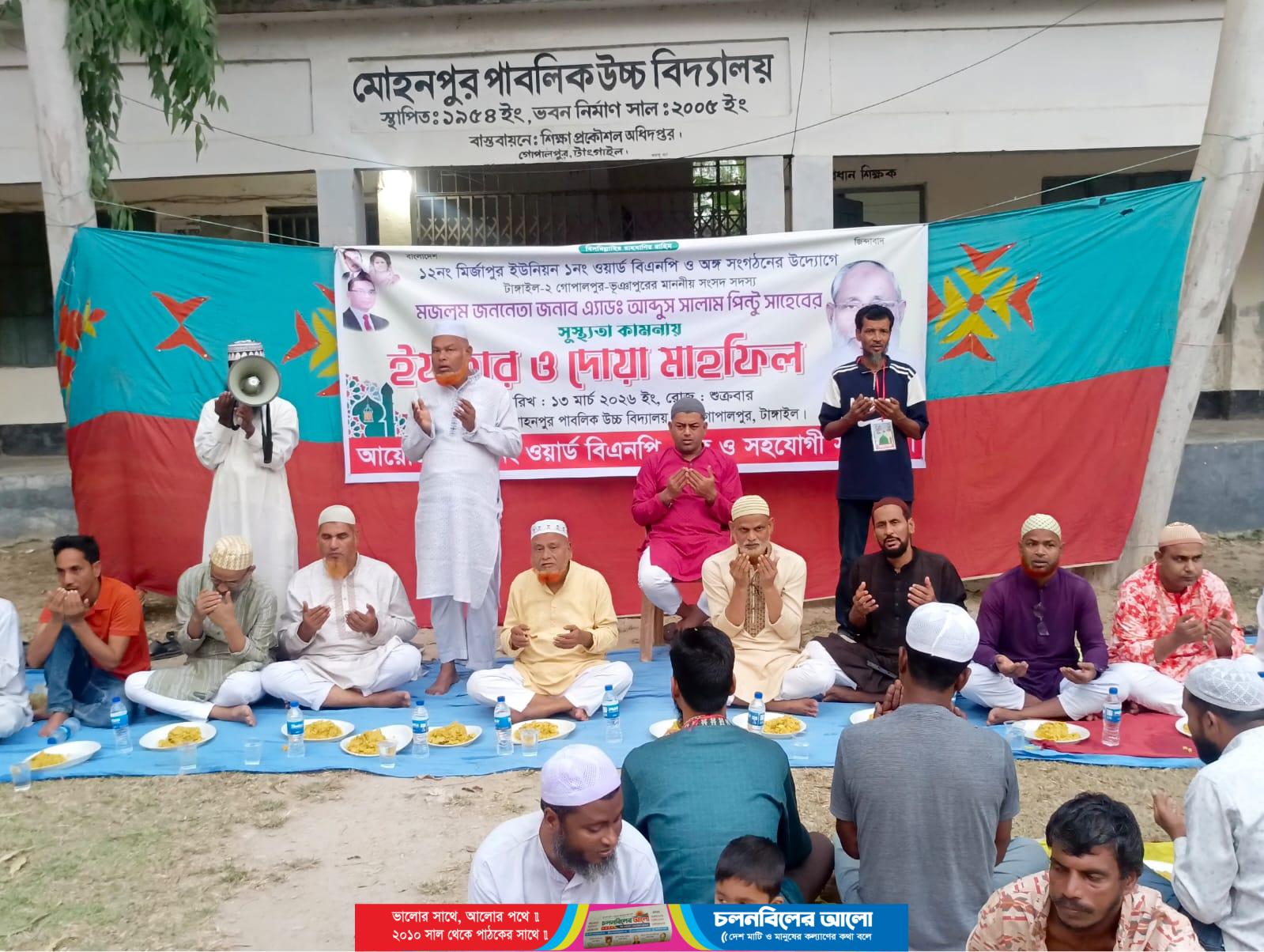 টাঙ্গাইলের গোপালপুর উপজেলার মির্জাপুর ইউনিয়নের ১ নম্বর ওয়ার্ড মোহনপুর বিএনপি ও এর অঙ্গসংগঠনের উদ্যোগে স্থানীয় সংসদ সদস্য অ্যাডভোকেট আব্দুস সালাম পিন্টুর সুস্থতা কামনায় ইফতার ও দোয়া মাহফিল অনুষ্ঠিত হয়েছে।