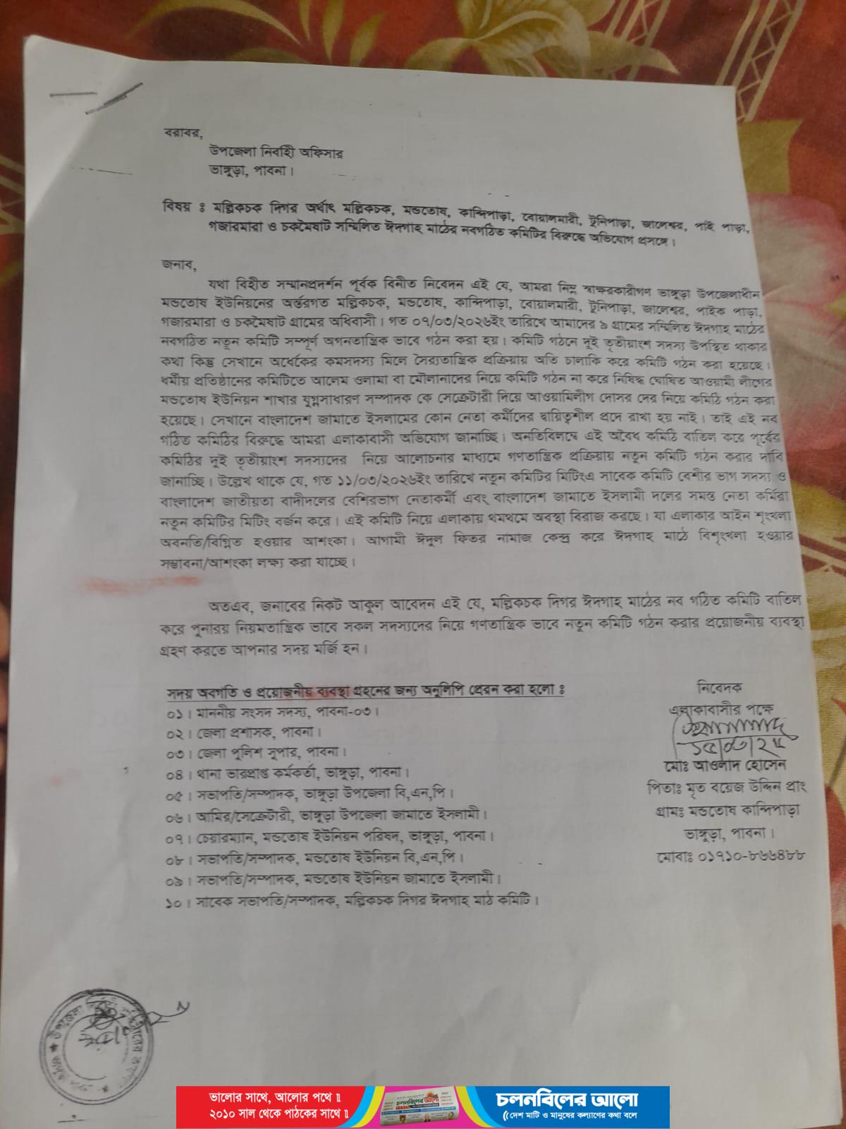 পাবনার ভাঙ্গুড়া চকদিগর অর্থাৎ মল্লিকচক,মন্ডতোষ,কান্দিপাড়া,বোয়ালমারী, টুনিপাড়া,জালেশ্বর,পাইক পাড়া,গজারমারা,চক মৌষাট, সম্মিলিত ঈদগাঁ মাঠের নব-গঠিত কমিটি বাতিল চেয়ে উপজেলা নির্বাহী কর্মকর্তা বরাবর লিখিত অভিযোগ দিয়েছেন, অত্র ঈদগাঁ মাঠের দাঁতা সদস্যের ছেলে আওলাদ হোসেন মাষ্টারসহ,বিএনপিপন্থি,জামাতপন্থী, আওয়ামী লীগপন্থী নয় গ্রামের ৭৫ জন নেতাকর্মী। গত রবিবার (১৫ মার্চ) এই লিখিত অভিযোগ দেওয়া হয়েছে।