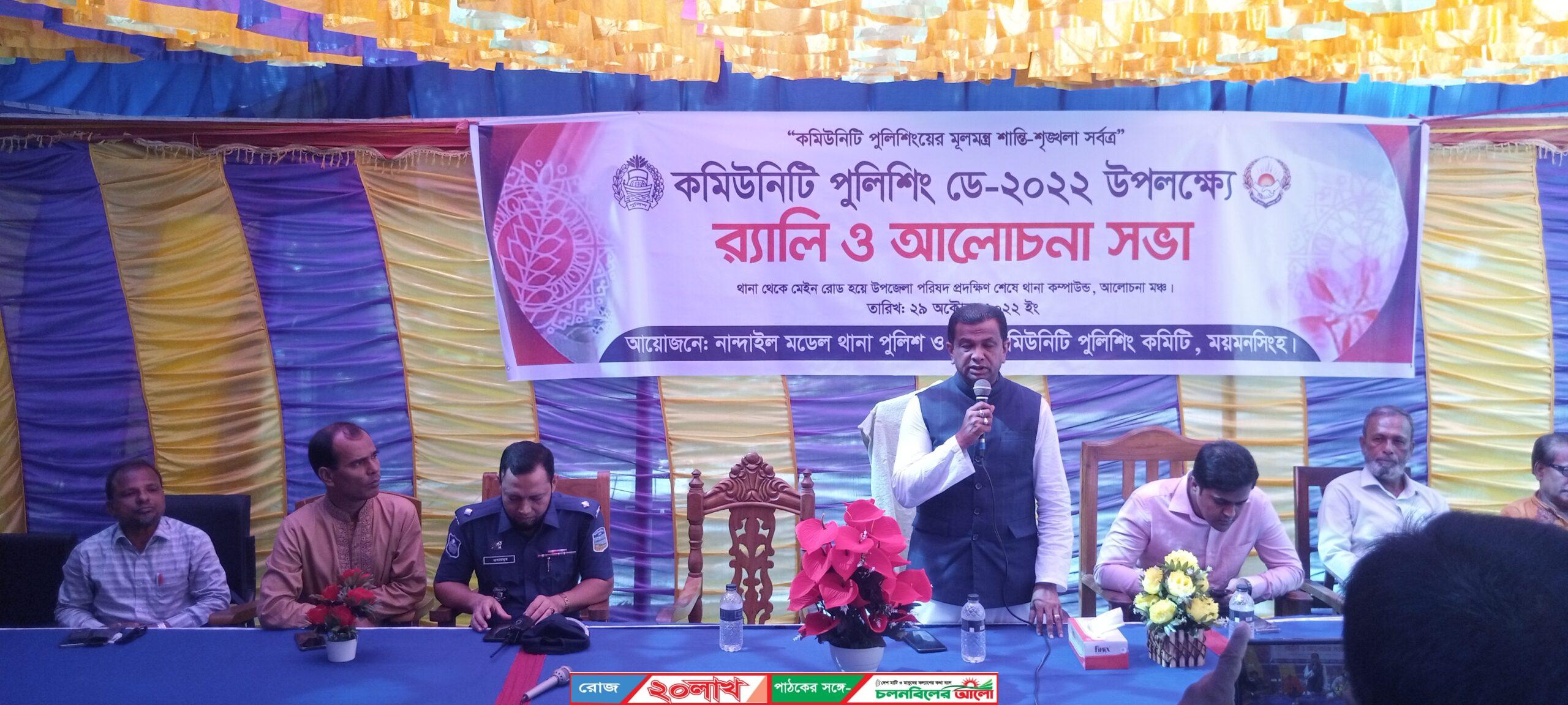 নান্দাইল মডেল থানার অফিসার ইনচার্জ (তদন্ত) উবায়দুর রহমানের সভাপতিত্বে অনুষ্ঠিত আলোচনা সভায় সংসদ সদস্য মো. আনোয়ারুল আবেদীন খান তুহিন প্রধান অতিথি, উপজেলা নির্বাহী অফিসার মোহাম্মদ আবুল মনসুর ও পৌর মেয়র রফিক উদ্দিন ভূইঁয়া বিশেষ অতিথি হিসাবে উপস্থিত থেকে বক্তব্য রাখেন। উপপরিদর্শক মো. বাবলুর রহমানের সঞ্চালনায় আলোচনা সভায় আরও বক্তব্য রাখেন উপজেলা পুলিশিং কমিটির সাধারন সম্পাদক মামুনুর রশিদ, নান্দাইল প্রেসক্লাবের সভাপতি মো. এনামুল হক বাবুল, রাজগাতী ইউপি চেয়ারম্যান মো. ইফতেখার মোমতাজ খোকন, শেরপুর ইউপি চেয়ারম্যান মোয়াজ্জেম হোসেন ভূইঁয়া মিল্টন, নান্দাইল সাংবাদিক সমিতির সভাপতি এবি সিদ্দিক খসরু প্রমুখ নেতৃবৃন্দ।