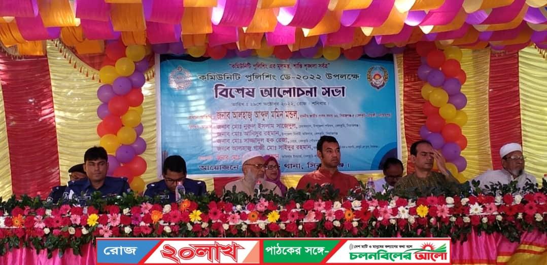 কমিউনিটি পুলিশিংয়ের মুলমন্ত্র,শান্তি শৃঙ্খলা সর্বত্র,এই স্লোগান সামনে রেখে,সিরাজগঞ্জের বেলকুচিতে নানা কর্মসূচির মধ্যে দিয়ে পালিত হয়েছে কমিউনিটি পুলিশিং ডে শনিবার (২৯ অক্টোবর)সকালে থানা চত্বরে বেলকুচি থানা কমিউনিটি পুলিশিং ফোরামের আয়োজনে পালিত হয়। আলোচনা সভায় সভাপতিত্বে করেন, বেলকুচি থানার ভারপ্রাপ্ত কর্মকর্তা (ওসি) তাজমিলুর রহমান।এ সময় প্রধান অতিথি হিসেবে উপস্থিত ছিলেন সিরাজগঞ্জ ৫ (বেলকুচি চৌহালী) আসনের সংসদ সদস্য ও উপজেলা আওয়ামী লীগের সভাপতি, আলহাজ্ব আব্দুল মমিন মন্ডল এমপি, বিশেষ অতিথি হিসেবে উপস্থিত ছিলেন উপজেলা পরিষদ চেয়ারম্যান নুরুল ইসলাম সাজেদুল, পৌর মেয়র সাজ্জাদুল হক রেজা, উপজেলা আওয়ামী লীগের সাধারণ সম্পাদক বেগম আশানুর বিশ্বাস,অতিরিক্ত পুলিশ সুপার সিদ্দিক আহাম্মেদ, বেলকুচি প্রেসক্লাবের সভাপতি গাজী সাইদুর রহমান, রাজাপুর ইউনিয়ন পরিষদের চেয়ারম্যান সনিয়া সবুর আকন্দ সহ আমন্ত্রিত অতিথিবৃন্দ।