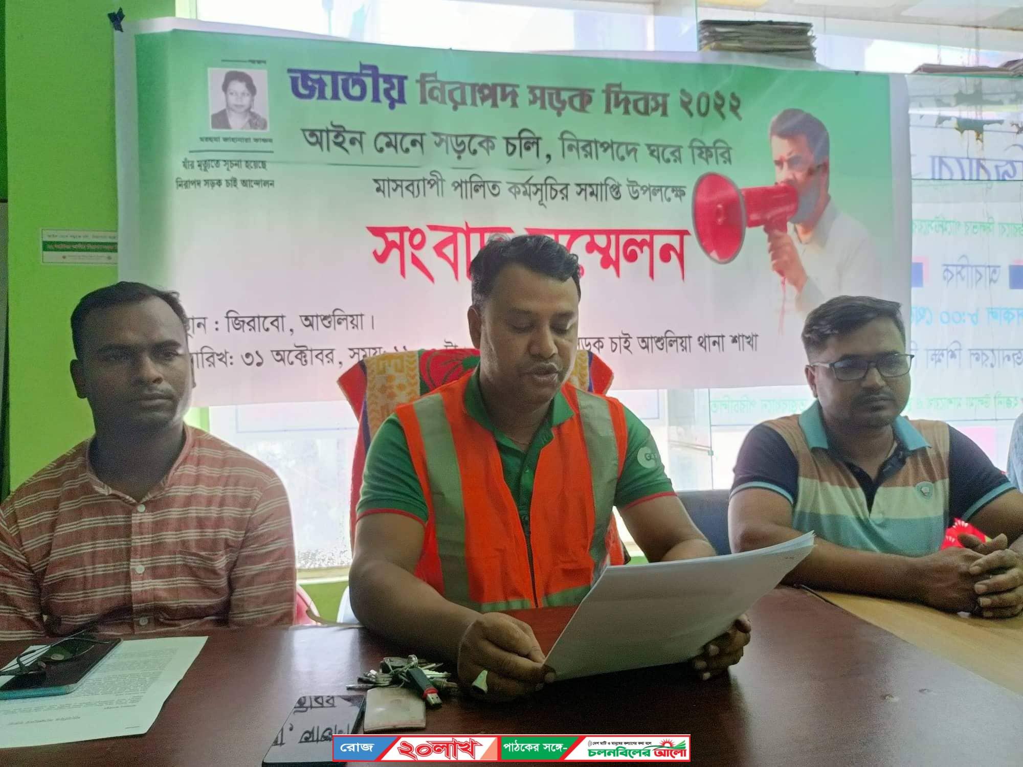 এসময় লিখিত বক্তব্য পেশ করেন নিরাপদ সড়ক চাই আশুলিয়া থানা কমিটির সভাপতি মোঃ শাকিল আহমেদ। তিনি বলেন, সড়ক নিরাপত্তার প্রতিটি গুরুত্ব দিয়ে নিরাপদ সড়ক চাই এবারের জাতীয় নিরাপদ সড়ক দিবসের কর্মসূচি পালন করেছে। কেন্দ্রীয় ও শাখা পর্যায়ে দেশে ও বিদেশে মোট ১১৩৭টি কর্মসূচি পালিত হয়েছে। ০১ অক্টোবর থেকে শুরু হয়ে শেষ হচ্ছে সড়ক পরিবহন আইনের বিধিমালা জারির দাবি জানিয়ে মাননীয় প্রধানমন্ত্রী বরাবর স্মারকলিপি প্রদান চালক প্রশিক্ষণ, শিক্ষক প্রশিক্ষণ, শিক্ষার্থী প্রশিক্ষণ, অভিভাবক সমাবেশ, বাস টার্মিনাল পরিবহন মালিক শ্রমিক সমাবেশ, ও সচেতনতা মূলক ক্যাম্পেইন, সুধী সমাবেশের আয়োজন, মতবিনিময়, সাংবাদিক সম্মেলন, আলোচনা সভা, গোলটেবিল আলোচনা, সেমিনার, ট্রাফিক ক্যাম্পেইন, র্যালী, সড়ক দূর্ঘটনায় ক্ষতিগ্রস্তদের সহায়তা প্রদান, ক্ষতিগ্রস্ত সড়ক মেরামত, সচেতনতা বৃদ্ধিতে লিফলেট বিতরণ, পোষ্টার প্রকাশ, ব্যানার ফেস্টুন স্থাপন, সড়কে বিভিন্ন ঝুঁকিপূর্ণ পয়েন্টে সতর্কতা মূলক প্রচার ও নির্দেশিকা স্থাপন, বৃক্ষরোপণ কর্মসূচি, বিভিন্ন গণমাধ্যমে চেয়ারম্যানের বিষয়ভিত্তিক নিবন্ধ প্রকাশ এবং ইলেকট্রনিক মিডিয়ার বিভিন্ন টকশোতে চেয়ারম্যানের অংশগ্রহণ। নিশচা চট্রগ্রাম মহানগর শাখার উদ্যোগে প্রায় তিনমাস ধরে চট্রগ্রামের তিন শতাধিক স্কুলের শিক্ষার্থীদের সড়ক নিরাপত্তা বিষয়ক প্রশিক্ষণ দিয়েছে। এই অক্টোবরেই ধারাবাহিক শিক্ষার্থী প্রশিক্ষণ কর্মসূচির সমাপ্তি হয়। এছাড়া তিনি সড়ক পরিবহন আইন ২০১৮ ব্যস্তবায়নের জন্য চুড়ান্ত বিধিমালা জারি করার দাবিতে স্মারকলিপি প্রদান করাসহ বিভিন্ন বিষয়ে তুলে ধরেন।
