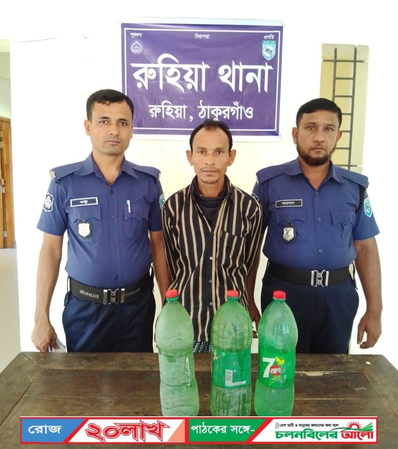 ঠাকুরগাঁও সদর উপজেলার রুহিয়ায় ৩ লিটার চোলাই মদ সহ সুমন সেন(৩৮) নামে একজনকে আটক করেছে পুলিশ।