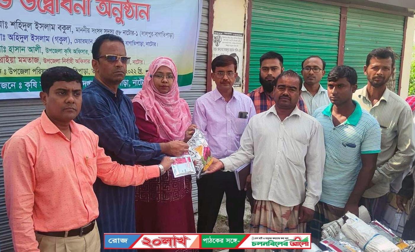 নাটোরের বাগাতিপাড়ায় কৃষি প্রণোদনা কর্মসূচী ২০২২-২৩ অর্থবছরে খরিপ মৌসুমে ক্ষুদ্র ও প্রান্তিক কৃষকদের মাঝে বিনামূল্যে গ্রীষ্মকালিন পেঁয়াজ বীজ, সার ও অন্যান্য উপকরণ বিতরণ করা হয়েছে। বৃহস্পতিবার সকালে উপজেলার পরিষদ চত্তরে কৃষি সম্প্রসারণ অধিদপ্তরের আয়োজনে ১০০ জন ক্ষুদ্র ও প্রান্তিক কৃষকদের মাঝে এসব প্রণোদনা বিতরণ করা হয়। বিতারণকালে ইউ.এন.ও (ভারপ্রাপ্ত) সুরাইয়া মমতাজ’র সভাপতিত্বে ও কৃষি কর্মকর্তা এম হাসান আলী’র সঞ্চালনায় উপস্থিত ছিলেন জেলা কৃষি সম্প্রসারণের উপ-পরিচালক আব্দুল ওয়াদুদ, উপজেলা পরিষদের চেয়ারম্যান অহিদুল ইসলাম গকুল ও উপজেলা প্রেসক্লাব’র আহŸায়ক আরিফুল ইসলাম তপু প্রমুখ। পরে পৌরসভা ও ৫ টি ইউনিয়নে ১০০ জন কৃষককে ১ কেজি পেঁয়াজ বীজ, ২০ কেজি ডিএপি, ২০কেজি এমওপি সার, পলিথিন, সুতলী ও ১’শ গ্রাম বালাইনাশক বিতরণ করা হয়। পাশাপাশি জমি প্রস্তুত, সেচ, বাঁশ ক্রয় ও শ্রমিক খরচ বাবদ সকলকে ‘বিকাশ’ এর মাধ্যমে নগদ ২ হাজার ৮শ’ টাকা প্রদান করা হবে বলে নিশ্চিত করা হয়।