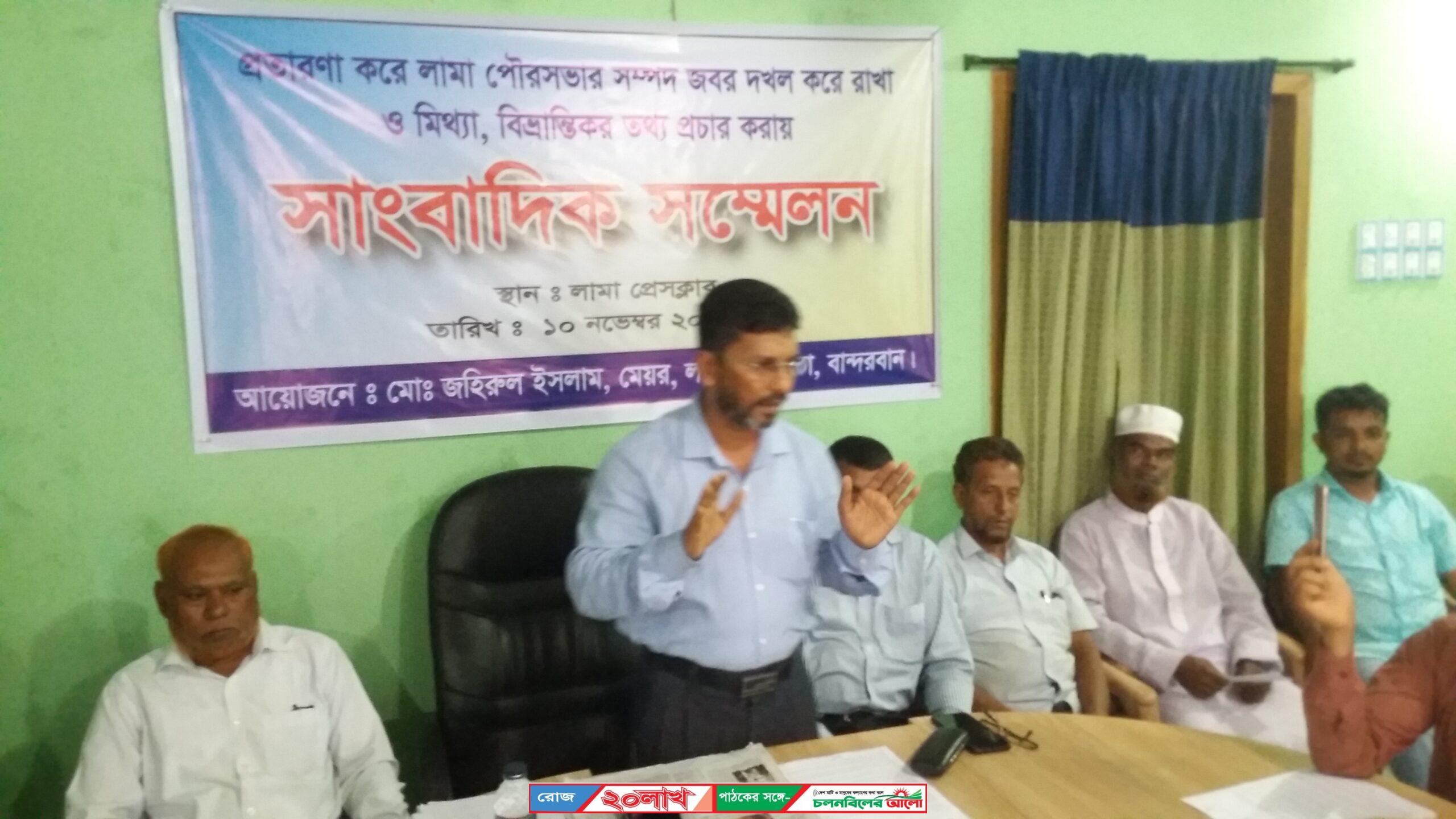 বান্দরবানের লামা পৌরসভার মেয়র মো. জহিরুল ইসলাম বলেছেন, জনৈক আক্তার উদ্দিন তপন ও তার পরিবারের সদস্যরা জনমনে মিথ্যা ও বিভ্রান্তি সৃষ্টি করে পৌরসভার সম্পদ স্থায়ী দখলের অপচেষ্টা করছেন। বৃহস্পতিবার (১০ নভেম্বর) বিকেলে লামা প্রেসক্লাব মিলনায়তনে আয়োজিত এক সংবাদ সম্মেলনে এ কথা বলেন তিনি। এ সময় তিনি আরো বলেন, গত কয়েকদিন ধরে -এ সংক্রান্ত বিষয়ে বিভ্রান্তিকর তথ্য প্রচার ও মিথ্যা তথ্য দিয়ে একটি পত্রিকায় সংবাদ ছাপিয়ে এতদ্বঞ্চলের পাহাড়ি ও বাঙ্গালীদের মধ্যে দীর্ঘদিনের সৌহাদপূর্ন সম্প্রীতি নষ্টের হীন চেষ্টাও লিপ্ত রয়েছেন আক্তার উদ্দিন তপনরা। আক্তার উদ্দিন তপন উপজেলার ফাঁসিয়াখালী ইউনিয়নের ত্রিশডেবা সরকারী প্রাথমিক বিদ্যালয়ের প্রধান শিক্ষক ও মুক্তিযোদ্ধা মৃত আলতাফ উদ্দিনের ছেলে। সংবাদ সম্মেলনে পৌরসভার প্যানেল মেয়র মোহাম্মদ হোসেন বাদশা, কাউন্সিলর মোহাম্মদ রফিক, মমতাজ উদ্দিন, আলী আহমদ, মহিলা কাউন্সিলর মরিয়ম বেগম ও সাকেরা বেগম, পৌর প্রকশলী জুলকার নাঈম মানিকসহ প্রমুখ উপস্থিত ছিলেন। এতে স্থানীয় প্রিন্ট ও ইলেকট্রনিক্স মিড়িয়া সাংবাদিকরা অংশ গ্রহণ করেন।