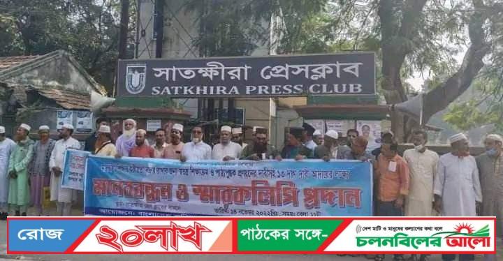 মাদ্রাসার শিক্ষার স্বাকীয়তা বজায় রাখার জন্য স্বতন্ত্র শিক্ষাক্রম ও পাঠ্যপুস্তক প্রত্যায়নের দাবিসহ সাতক্ষীরায় ১৩ দফা দাবিতে মাদ্রাসার শিক্ষকদের মানববন্ধন অনুষ্ঠিত হয়েছে।