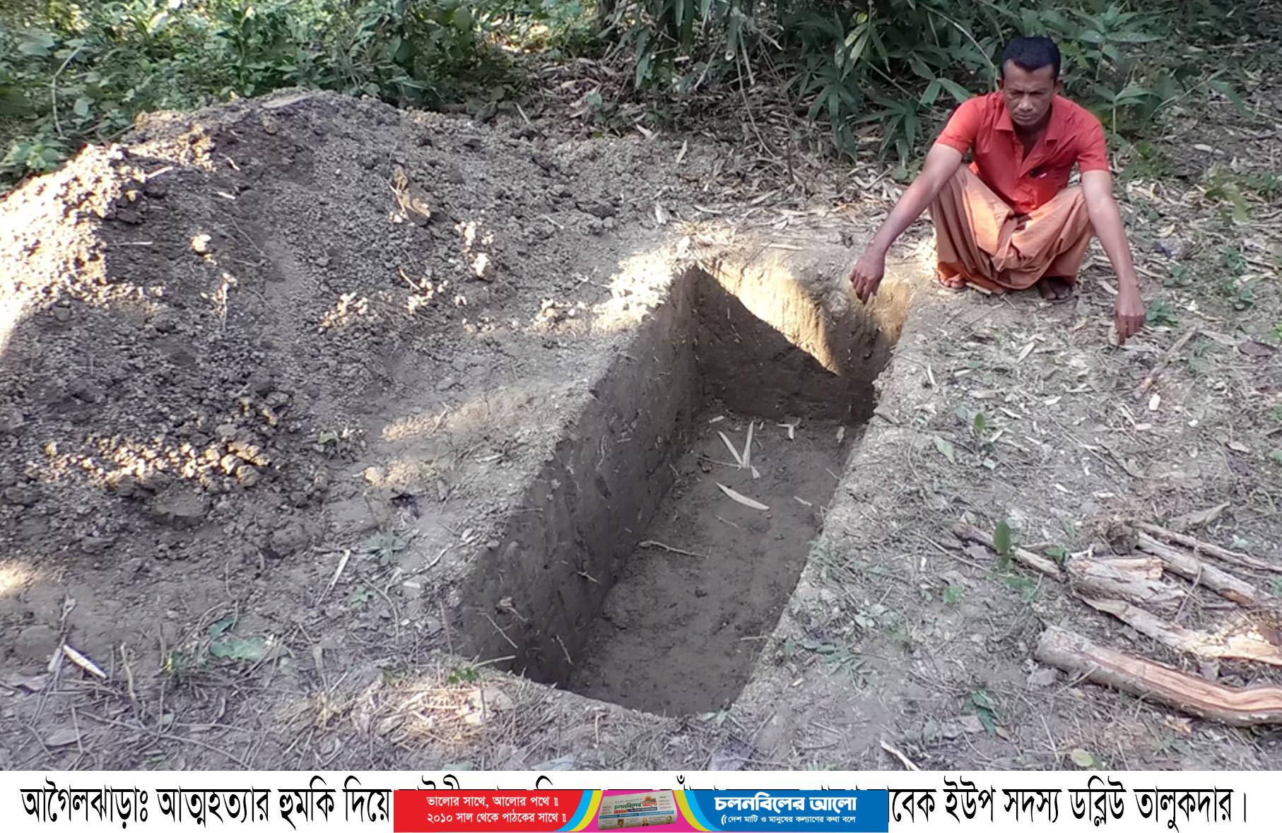 শনিবার সকালে সরেজমিন উপজেলার চেঙ্গুগুটিয়া গ্রামে গিয়ে দেখা যায় সাবেক ইউপি সদস্য ডব্লিউ তালুকদার আতœহত্যা করতে একটি কবর খুড়ছেন। ডব্লিউ তালুকদার সাংবাদিকদের জানান, আমি পরিবারসহ ঢাকায় এক বছর পূর্বে বেড়াতে গেলে নিজের নির্মাণ করা পাকা ভবনের তালা ভেঙ্গে বড় ভাই বাহালুল তালুকদার তা দখলে নিয়ে পরিবারসহ বসবাস করে আসছে। আমার ভবন ফিরে পাওয়ার জন্য বিভিন্ন লোকজনের কাছে ধর্ণা দিয়েও কোন সমাধান পাইনি। যার কারনে আমি বিভিন্ন বাড়িতে ছেলে-মেয়ে, স্ত্রী নিয়ে আশ্রয় নিয়েছি। ভবনের সমাধান না পেলে পরিবারের সবাইকে নিয়ে আত্নহত্যার করার জন্য কবর খুড়েছি।