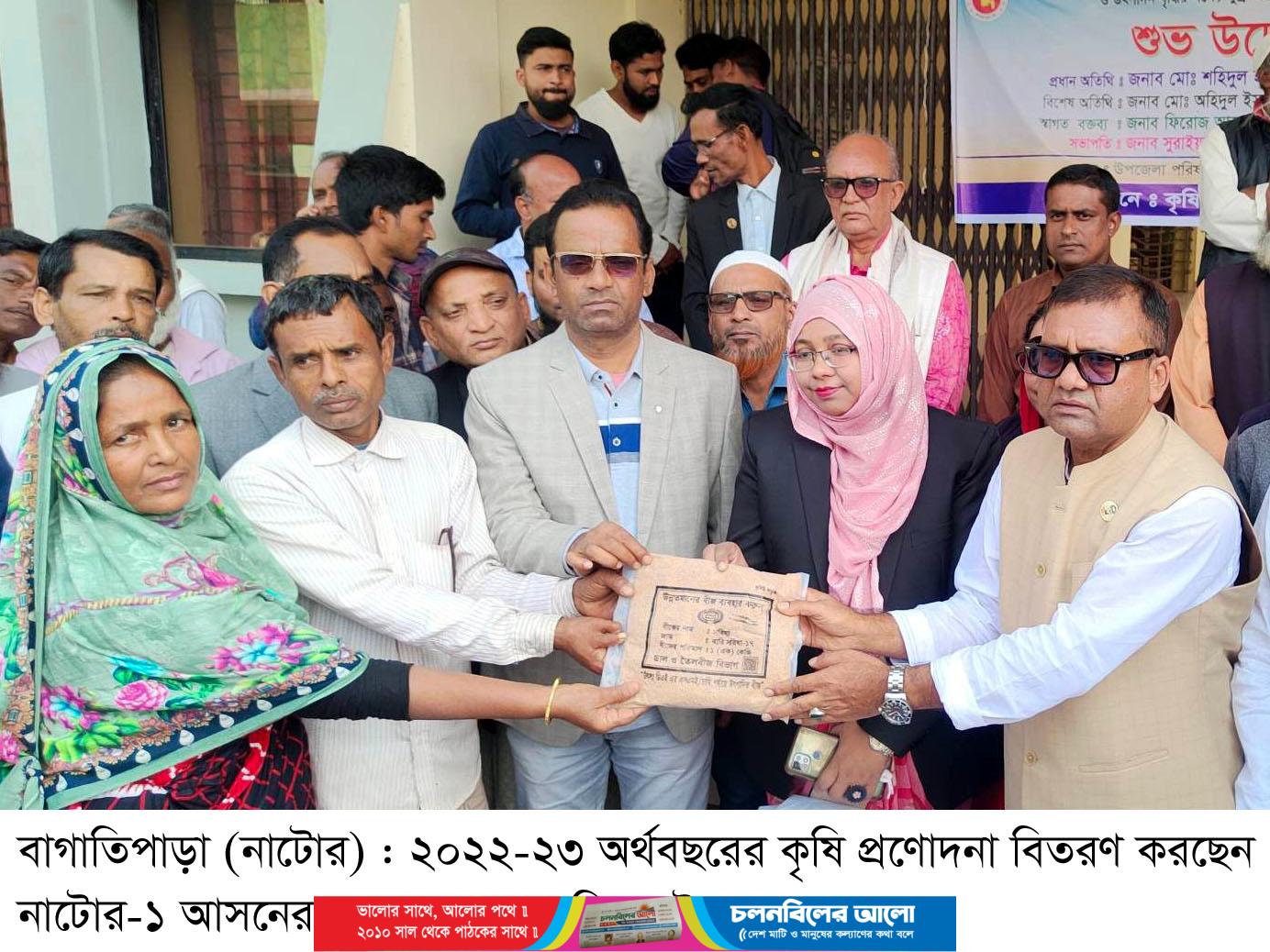 নাটোরের বাগাতিপাড়ায় ২০২২-২৩ অর্থবছরে প্রণোদনা কর্মসূচির আওতায় রবি মৌসুমে আবাধ ও উৎপাদন বৃদ্ধির লক্ষ্যে ২৭’শ ক্ষুদ্র ও প্রান্তিক কৃষকদের মাঝে গম, সরিষা, মসুর ডাল, খেসারি ডাল, শীতকালিন পেঁয়াজ, মুগডাল, ভুট্টা, সূর্যমুখী সহ বিভিন্ন ফসলের বীজ ও রাসায়নিক সার বিনামূল্যে বিতরণ কর্মসূচির উদ্বোধন করা হয়েছে। বুধবার সকালে উপজেলা প্রশাসনিক ভবনের সামনে কৃষি সম্প্রসারণ অধিদপ্তরের আয়োজনে ও ইউএনও (ভারপ্রাপ্ত) সুরাইয়া মমতাজ’র সভাপতিত্বে প্রধান অতিথি হিসেবে উপস্থিত থেকে এর উদ্বোধন করেন স্থানীয় সংসদ সদস্য শহিদুল ইসলাম বকুল। বিশেষ অতিথি ছিলেন উপজেলা চেয়ারম্যান অহিদুল ইসলাম গকুল। এসময় উপজেলা কৃষি কর্মকর্তা (ভারঃ) ফিরোজ আহমেদ’র স্বাগত বক্তব্যে আরও উপস্থিত ছিলেন, উপজেলা আওয়ামী লীগের সভাপতি নুরুল ইসলাম ঠান্ডু ও সহ-সভাপতি আব্দুল ওয়াহাব প্রমুখ।