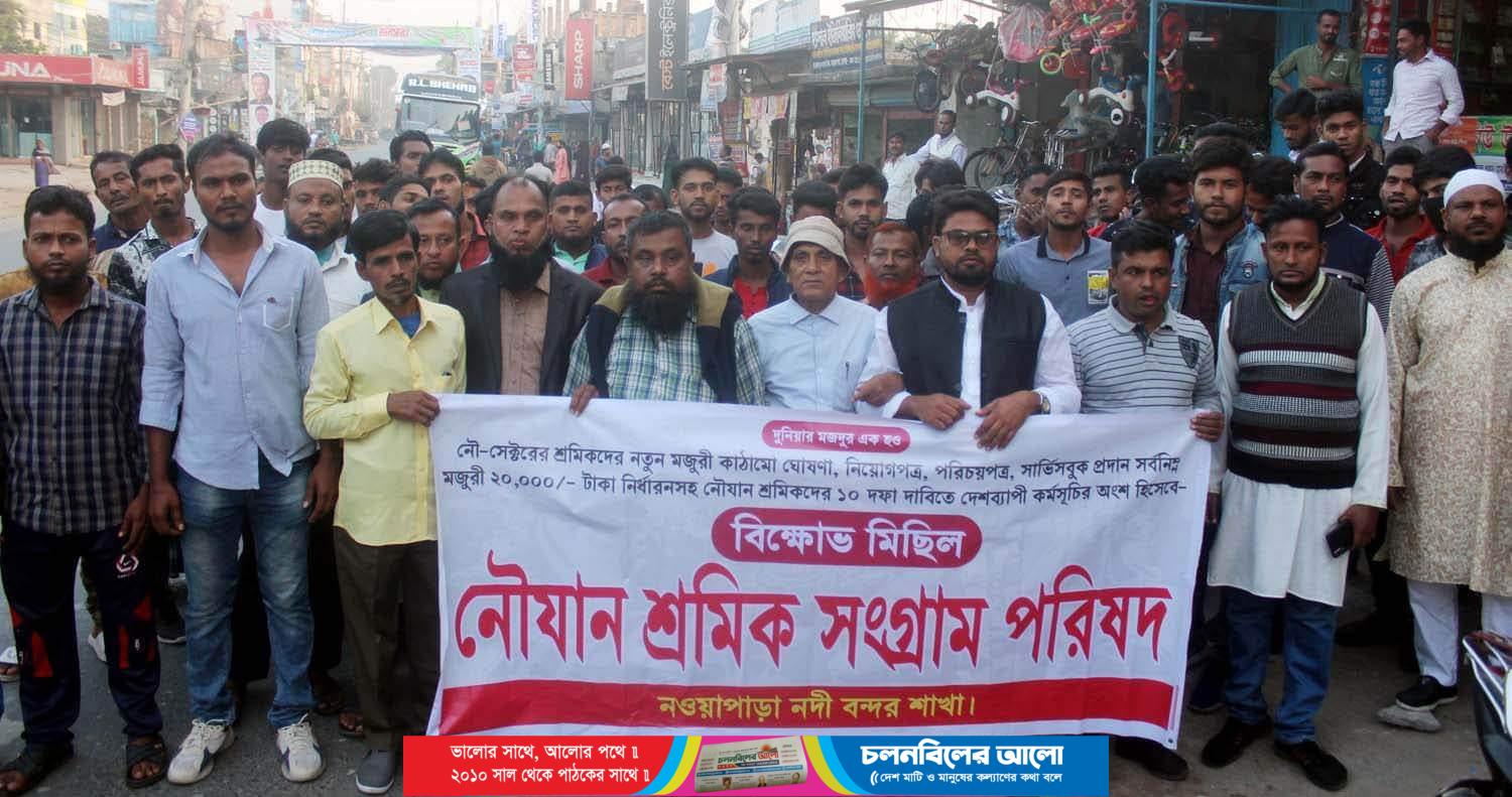 যশোরের অভয়নগরে নৌযান শ্রমিক সংগ্রাম পরিষদের বিক্ষোভ মিছিল অনুষ্ঠিত হয়েছে। রোববার (২৭ নভেম্বর) বিকেলে নৌ-সেক্টরে শ্রমিকদের নতুন মুজুরী কাঠামো ঘোষণা, নিয়োগপত্র, পরিচয়পত্র, সার্ভিসবুক প্রদানসহ ১০ দফা দাবীতে দেশব্যাপি কর্মসূচির অংশ হিসাবে নওয়াপাড়া নদী বন্দর শাখার উদ্যোগে এ বিক্ষোভ মিছিল অনুষ্ঠিত হয়। নওয়াপাড়া নৌযান ফেডারেশনের আঞ্চলিক শাখা অফিসের সামনে থেকে মিছিলটি বের হয়ে নওয়াপাড়া বাজারের যশোর-খুলনা মহাসড়ক প্রদক্ষিণ করে আবার একই স্থানে গিয়ে শেষ হয়। এসময় শ্রমিকদের উদ্দেশ্যে বক্তব্য রাখেন, বাংলাদেশ লন্স লেবার এসোসিয়েশনের খুলনা শাখার যুগ্ম সাধারণ সম্পাদক রুবেল মাস্টার, বাংলামেশ নৌযান ফেডারেশনের খুলনা বিভাগীয় কমিটির উপদেষ্টা আশুতোশ বিশ্বাস, নারায়নগঞ্জ শাখার সহ সভাপতি বিল্লাল হোসেন মাস্টার, খুলনা বিভাগীয় কমিটির উপদেষ্টা রেজাউল করিম, খুলনা বিভাগীয় কমিটির সাংগঠনিক সম্পাদক জসিম মাস্টার। এছাড়াও উপস্থিত ছিলেন, শ্রমীক নেতা কাইয়ুম মাস্টার, মিজান মাস্টার, সুজন ড্রাইভার, আবু সালেহ ড্রাইভার প্রমুখ। এসময় অনতিবিলম্বে ১০ দফা দাবী মেনে নিতে সরকার ও মালিক পক্ষকে আহবান জানান বক্তারা। উল্লেখ্য শনিবার রাত থেকে সারাদেশে অনির্দিষ্টকালের জন্য কর্মবিরতি শুরু করে নৌযান শ্রমিক ফেডারেশন।