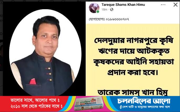 নাগরপুর দেলদুয়ারের যদি কোন কৃষক কৃষি ঋণের দায়ে আইনি জটিলতায় পড়ে যান তাদেরকে আইনি সহযোগিতা দেওয়ার জন্য তাৎক্ষণিকভাবে উদ্যোগ গ্রহণ করলেন বাংলাদেশ আওয়ামীলীগ কেন্দ্রীয় যুব ও ক্রীড়া উপ-কমিটির অন্যতম প্রভাবশালী সদস্য, নাগরপুর উপজেলা আওয়ামী লীগের সম্মানিত সদস্য, জননন্দিত কর্মীবান্ধব জননেতা তারেক সামস্ খান হিমু।