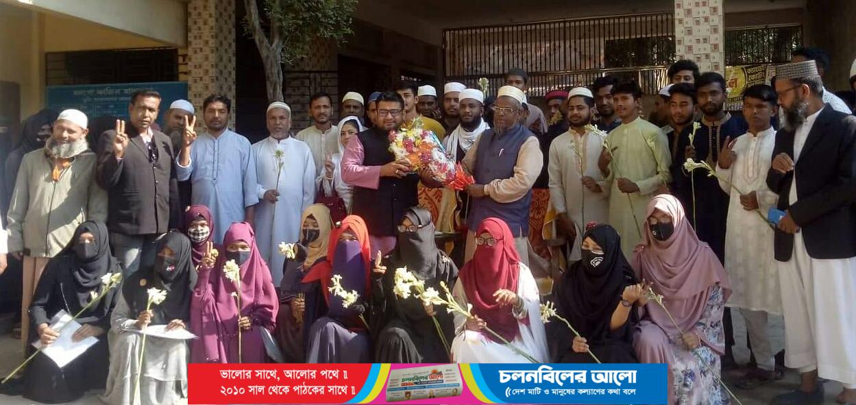 মাদ্রাসার পক্ষ হতে জিপিএ-৫  প্রাপ্তদের সংবর্ধনা দেয়া হয়েছে। এ সময় আনন্দে ভরে ওঠে মাদ্রাসা প্রাঙ্গণ। অভিভাবকসহ উত্তীর্ণরা ধন্যবাদ জানায় প্রতিষ্ঠানের অধ্যক্ষ ও সকল শিক্ষকদের। উত্তীর্ণ সকল শিক্ষার্থীরা জানায়,আমাদের এই   সফলতার জন্য প্রতিষ্ঠানের অভিজ্ঞ শিক্ষকমন্ডলীদের ভুমিকাই মুখ্য। সফলতার ধারা অব্যাহত রাখতে শিক্ষক, শিক্ষার্থী, অভিভাবক,কমিটিসহ সবার সহযোগীতা কামনা করেন প্রতিষ্ঠানের অধ্যক্ষ মাও: আ: মজিদ। মাদ্রাসা ম্যানেজিং কমিটির সভাপতি রিয়াদুল ইসলাম ফরিদ এবারের দাখিল পরীক্ষার ফলাফলে সন্তোষ প্রকাশ করে জানান,নিবেদিত প্রাণ,একনিষ্ঠ অধ্যক্ষ মাও: আ: মজিদসহ সকল শিক্ষকদের ঐকান্তিক প্রচেষ্টার কারনেই এমন ফলাফল সম্ভব হয়েছে।