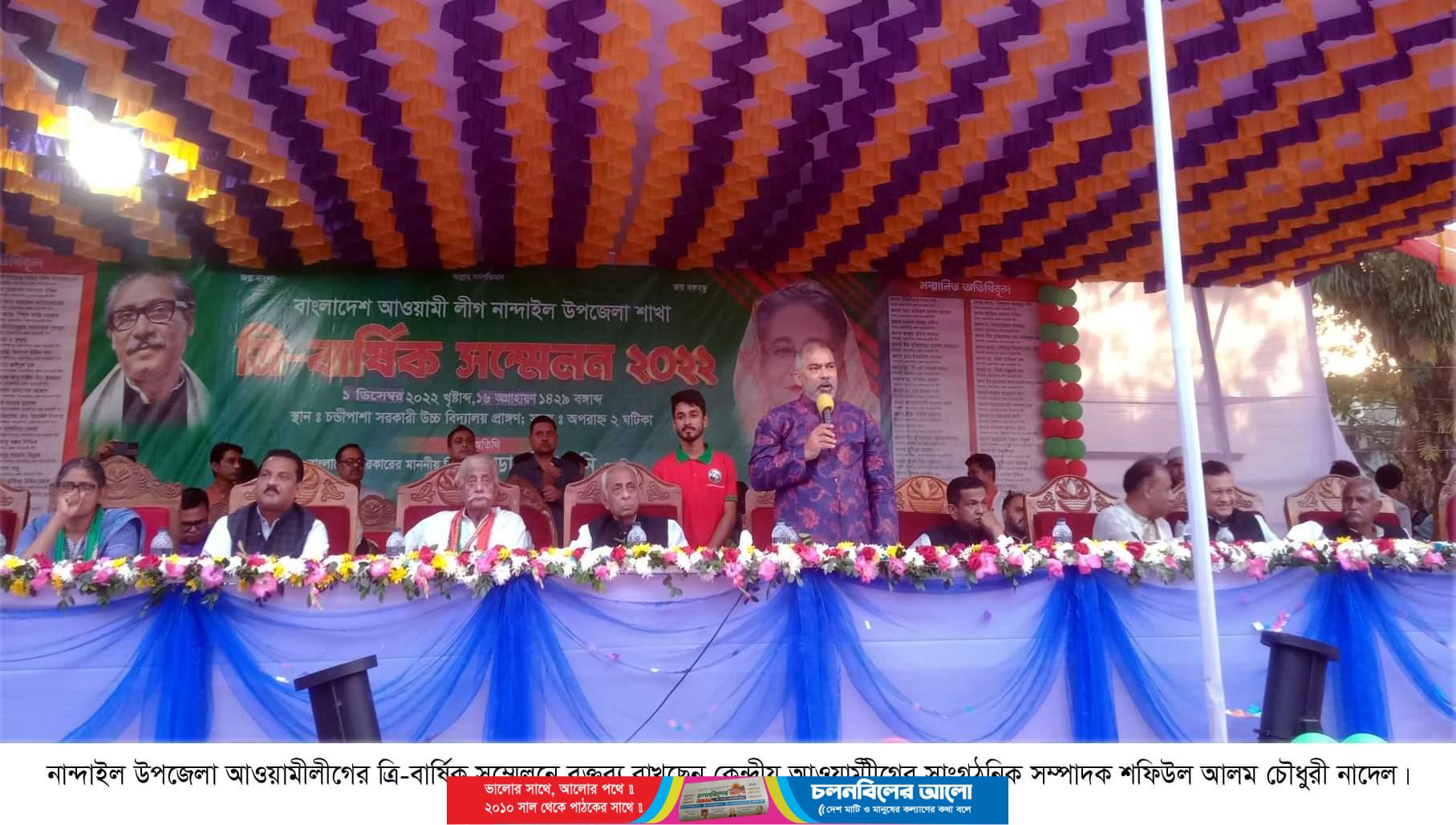 ময়মনসিংহ নান্দাইল উপজেলা আওয়ামীলীগের ত্রি-বার্ষিক সম্মেলন বৃহস্পতিবার (১লা ডিসেম্বর) চন্ডীপাশা সরকারী উচ্চ বিদ্যালয় খেলার মাঠে অনুষ্ঠিত হয়েছে। উপজেলা আওয়ামীলীগের সভাপতি মেজর জেনারেল (অব:) আবদুস সালামের সভাপতিত্বে অনুষ্ঠিত সম্মেলনে বাংলাদেশ আওয়ামীলীগের সাংগঠনিক সম্পাদক শফিউল আলম চৌধুরী নাদেল প্রধান অতিথি হিসাবে উপস্থিত ছিলেন। আমিনুল ইসলাম শাহান ও নজিবুল্লাহ লিটনের সঞ্চালনায় অনুষ্ঠিত সম্মেলনে কেন্দ্রীয় আওয়ামীলীগের সাংস্কৃতিক সম্পাদক অসীম কুমার উকিল এমপি, আওয়ামীলীগের প্রেসিডিয়াম সদস্য বেগম মারুফা আক্তার পপি, রেমন্ড আরেং বিশেষ অতিথি হিসাবে উপস্থিত ছিলেন। সম্মেলনে বক্তব্য রাখেন প্রতিমন্ত্রী শরীফ আহম্মেদ, উদ্বোধক ময়মনসিংহ জেলা আওয়ামীলীগের সভাপতি এডভোকেট জহিরুল হক খোকা, প্রধান বক্তা জেলা আওয়ামীলীগের সাধারণ সম্পাদক এডভোকেট মোয়াজ্জেম হোসেন বাবুল সহ জেলা ও উপজেলা আওয়ামীলীগের নেতৃবৃন্দ বক্তব্য রাখেন। সম্মেলনে ১৩টি ইউনিয়ন ও পৌর সভা এলাকা থেকে বিপুল সংখ্যক নেতাকর্মী মিছিল, ব্যান্ড পাটি সহ যোগদান করে সম্মলন সফল করেন। রিপোর্ট পাঠানো পর্যন্ত সম্মেলনের দ্বিতীয় পর্ব কাউন্সিল অধিবেশন চলছে।