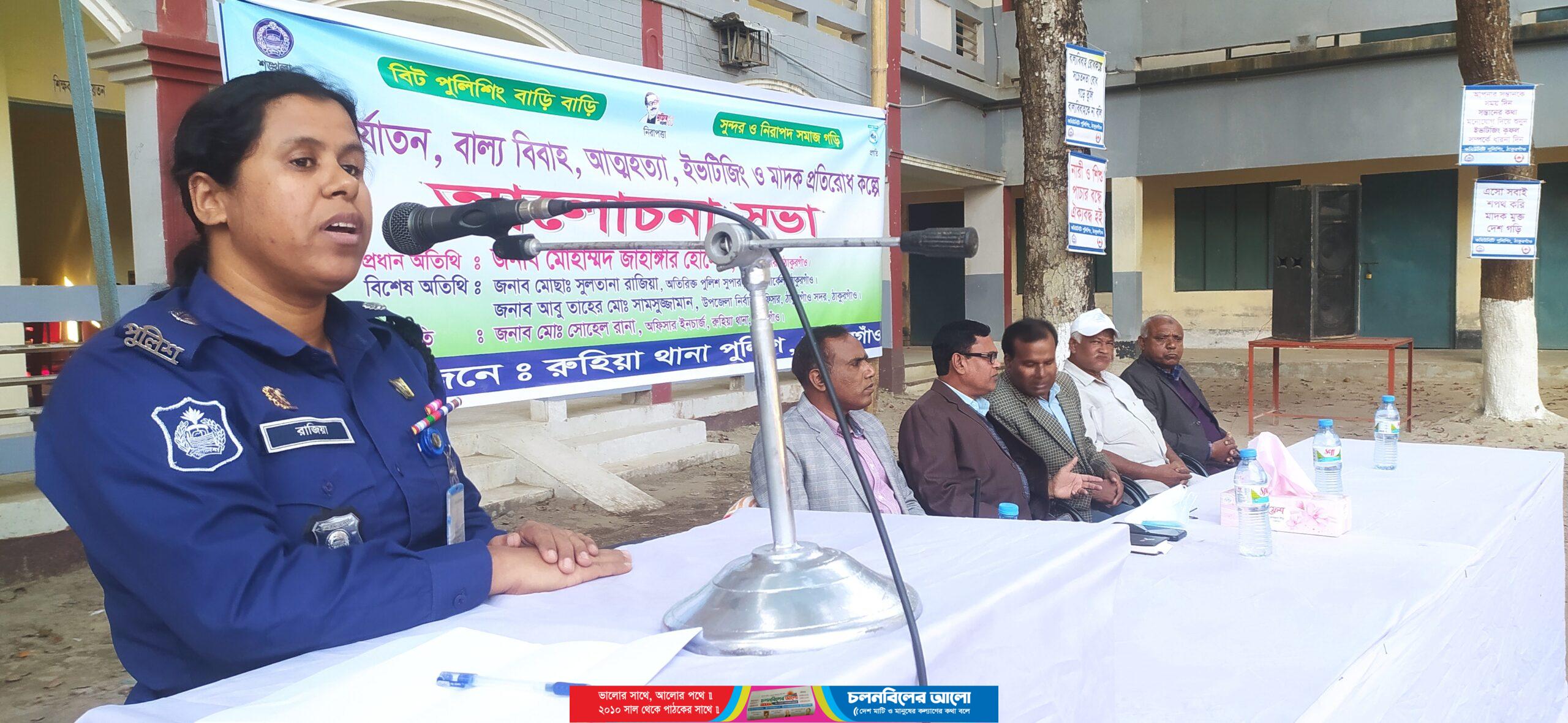 পুলিশের সেবাকে জনগণের নিকট পৌঁছে দেওয়া, সেবার কার্যক্রমকে গতিশীল ও কার্যকর করতে এবং পুলিশের সাথে জনগণের সম্পৃক্ততা বৃদ্ধি করার লক্ষে “বিট পুলিশিং বাড়ি বাড়ি, নিরাপদ সমাজ গড়ি” এই শ্লোগানে ঠাকুরগাঁওয়ে রুহিয়া থানার আয়োজনে ছাত্র-ছাত্রী ও অভিভাবকদের মাঝে নারী নির্যাতন,বাল্য বিবাহ, আত্মহত্যা, ইভটিজিং ও মাদক প্রতিরোধ কল্পে আলোচনা সভা অনুষ্ঠিত হয়েছে।