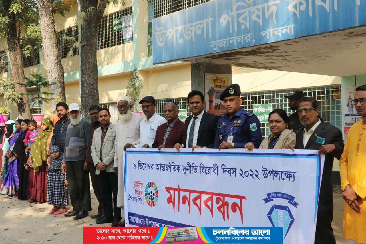 দুর্নীতির বিরুদ্ধ ঐক্যবন্ধ বিশ্ব প্রতিপাদ্যকে সামনে রেখে, উপজেলা প্রশাসন ও উপজেলা দুর্নীতি প্রতিরোধ কমিটি আয়োজনে, আন্তর্জাতিক দুর্নীতি বিরোধী দিবসের মানববন্ধন ও আলোচনা সভা অনুষ্ঠিত হয়েছে। শুক্রবার সকালে পাবনার সুজানগর উপজেলা চত্বরে দুর্নীতি বিরোধী মানববন্ধন শেষে উপজেলা পরিষদের হল রুমে আলোচনা সভা অনুষ্ঠিত হয়। আলোচনা সভায় প্রধান অতিথির বক্তব্য দেন, উপজেলা নির্বাহী কর্মকর্তা তরিকুল ইসলাম। উপজেলা দুর্নীতি প্রতিরোধ কমিটির সভাপতি বীরমুক্তিযোদ্ধা মশিউর রহমানের সভাপতিত্বে ও সাধারণ সম্পাদক সাংবাদিক আব্দুল আলীম রিপনের সঞ্চালনায় বিশেষ অতিথির বক্তব্য দেন, থানার ভারপ্রাপ্ত কর্মকর্তা (ওসি)আব্দুল হাননান, উপজেলা মহিলা ভাইস চেয়ারম্যান মর্জিনা খাতুন। এ সময় আরো বক্তব্য দেন, উপজেলা মহিলা বিষয়ক কর্মকর্তা আফজাল হোসেন, মহিলা কলেজের (ভারপ্রাপ্ত) অধ্যক্ষ শাজাহান আলী, শহীদ দুলাল পাইলট উচ্চ বালিকা বিদ্যালয়ের প্রধান শিক্ষক মনসুর আলী, অবসরপ্রাপ্ত শিক্ষক আব্দুল জব্বার।