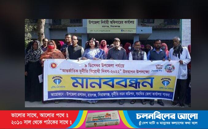 দুর্নীতির বিরুদ্ধে ঐক্যবদ্ধ বিশ্ব- এ প্রতিপাদ্য নিয়ে সিরাজগঞ্জের রায়গঞ্জ উপজেলায় আন্তর্জাতিক দুর্নীতি বিরোধী দিবস পালিত হয়েছে। শুক্রবার সকাল ১০টার দিকে উপজেলা পরিষদ সভাকক্ষে আয়োজিত আলোচনা সভায় সভাপতিত্ব করেন, ইউএনও তৃপ্তি কণা মন্ডল। দুর্নীতি দমন ও প্রতিরোধে করণীয় বিষয়ে বক্তব্য রাখেন, উপজেলা দুর্নীতি প্রতিরোধ কমিটির সভাপতি ও চান্দাইকোনা হাজী ওয়াহেদ- মরিয়ম কলেজের সাবেক অধ্যক্ষ মুহ. শামসুল হক, সাধারণ সম্পাদক ও উপজেলা সদর ধানগড়া মহিলা কলেজের বাংলা বিষয়ের সহকারী অধ্যাপক সাজেদুল আলম, উপজেলা সমাজসেবা কর্মকর্তা মো. ইলিয়াস হাসান সেখ, ধানঘরা উচ্চবিদ্যালয়ের সাবেক প্রধান শিক্ষক বিজয় কুমার সাহা, রায়গঞ্জ প্রেসক্লাবের সভাপতি কে,এম রফিকুল ইসলাম, সাংবাদিক আতিক মাহমুদ প্রমুখ। এ সময় উপজেলা পরিষদের বিভিন্ন দপ্তরের কর্মকর্তা, সাংবাদিক, শিক্ষক- শিক্ষার্থী-অভিভাবকসহ নানা শ্রেণি-পেশার প্রতিনিধিগগণ উপস্থিত ছিলেন। পরে উপজেলা পরিষদ চত্বরে দুর্নীতিবিরোধী মানববন্ধন অনুষ্ঠিত হয়।