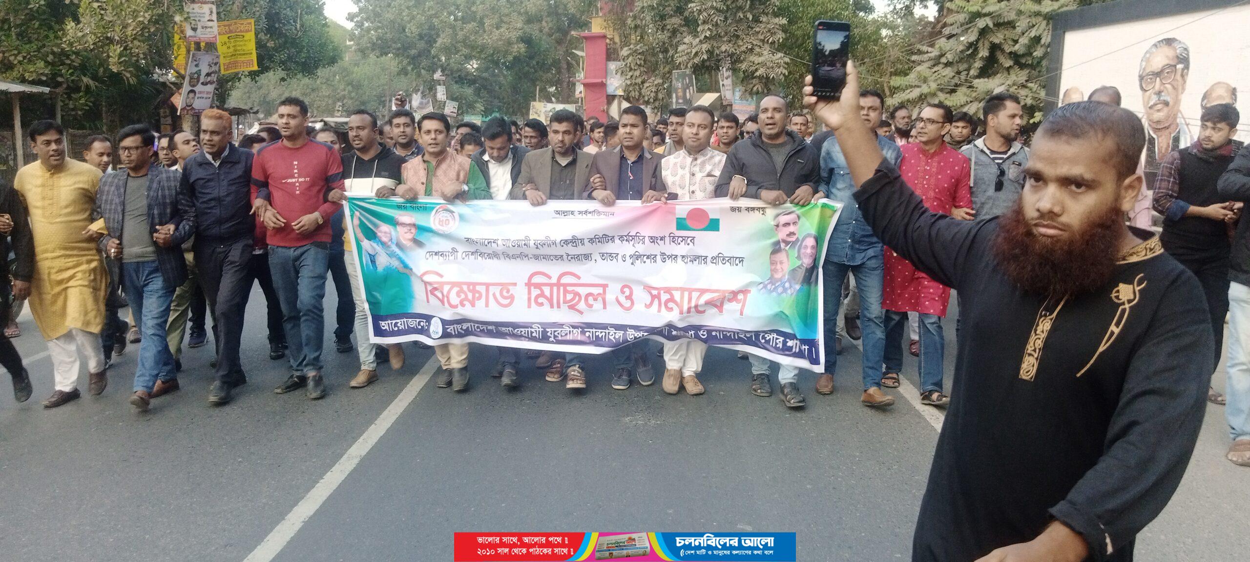 ময়মনসিংহের নান্দাইল উপজেলা যুবলীগের উদ্দ্যোগে শনিবার (১০ ডিসেম্বর) বিকালে নান্দাইল উপজেলা সদরে বিএনপি ও জামাত শিবিরের সন্ত্রাসী কর্মকান্ডের প্রতিবাদে এক বিরাট বিক্ষোভ মিছিল ও প্রতিবাদ সমাবেশ অনুষ্ঠিত হয়েছে।