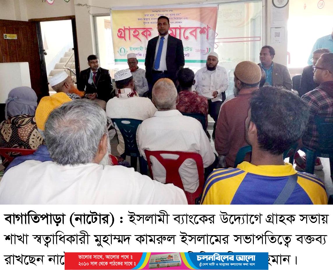 নাটোরের বাগাতিপাড়ায় বাংলাদেশ ইসলামী ব্যাংকের উদ্যোগে গ্রাহক সমাবেশ অনুষ্ঠিত হয়েছে। বৃহম্পতিবার সকালে উপজেলার মালঞ্চি বাজারস্থ কার্যালয়ের আউটলেটে এই সমাবেশ অনুষ্ঠিত হয়। সমাবেশে শাখা স্বত্বাধিকারী মুহাম্মদ কামরুল ইসলামের সভাপতিত্বে প্রধান অতিথি ছিলেন ইসলামী ব্যাংক নাটোর শাখার ম্যানেজার এভিপি হাবিবুর রহমান। বিশেষ অতিথি ছিলেন জাতীয় সাংবাদিক সংস্থার সহকারী মহাসচিব আব্দুল মজিদ, পেড়াবাড়িয়া দাখিল মাদ্রাসার সুপার শামসুল আরেফিন, ইসলামী ব্যাংকের প্রিন্সিপাল অফিসার শহিদুল ইসলাম ও অফিসার আশরাফুল ইসলাম প্রমুখ। সমাবেশ শেষে ৭ জন গ্রাহককে ২ ক্যাটাগরিতে পুরুষ্কার প্রদান করা হয়।