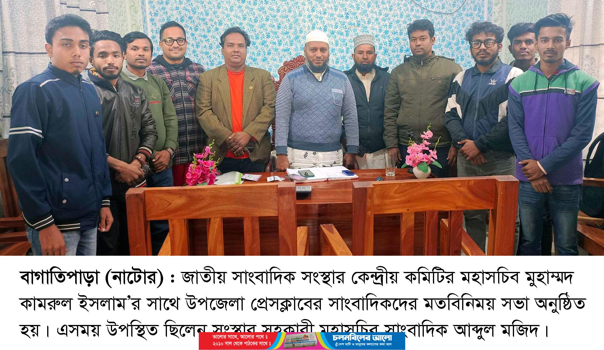 নাটোরের বাগাতিপাড়ায় জাতীয় সাংবাদিক সংস্থার কেন্দ্রেীয় মহাসচিব মুহাম্মদ কামরুল ইসলাম’র সাথে উপজেলা প্রেসক্লাবের সাংবাদিকদের মতবিনিময় সভা অনুষ্ঠিত হয়েছে। বৃহস্মতিবার সকালে সংস্থার স্থানীয় শাখার অস্থায়ী কার্যালয়ে এ মতবিনিময় সভা অনুষ্ঠিত হয়। এসময় উপস্থিত ছিলেন, জাতীয় সাংবাদিক সংস্থার সহকারী মহাসচিব আব্দুল মজিদ, সহকারী প্রচার ও প্রকাশনা সম্পাদক আরিফুল ইসলাম তপু, উপজেলা প্রেসক্লাবের সাংগঠনিক সম্পাদক এম. খাদেমুল ইসলাম, সদস্য সোহেল রানা তুহিন, আকরাম আলী, আনিসুর রহমান, নিশাতুর রহমান, ইমতিয়াজ আহম্মদ ও পিওম মন্ডল প্রমুখ।