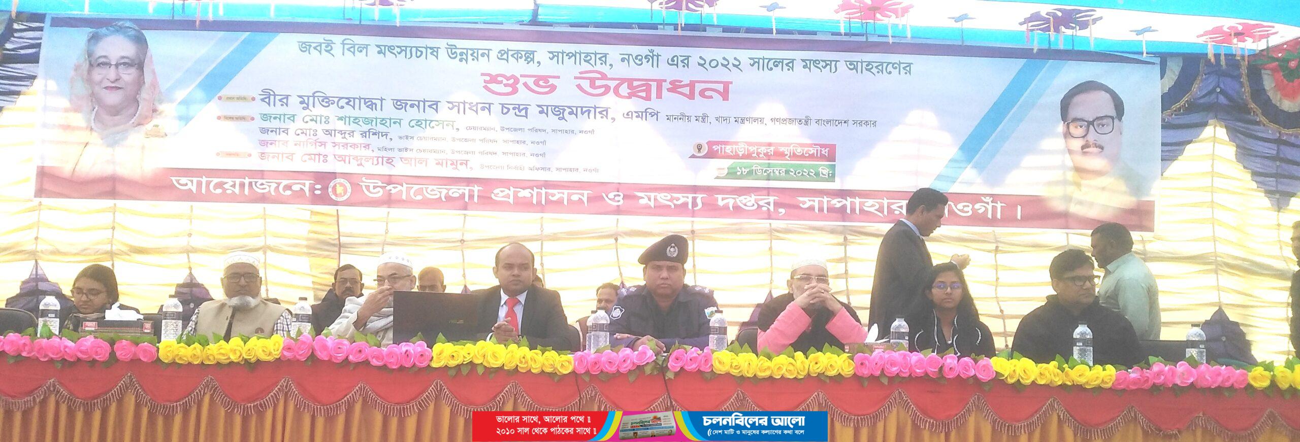 নওগাঁর সাপাহারে জবই বিল মৎস্যচাষ উন্নয়ন প্রকল্পের ২৩ তম মৎস্য আহরণের শুভ উদ্বোধনী ঘোষনা করা হয়েছে। ভার্চুয়ালী শুভ উদ্বোধন করেন গণপ্রজাতন্ত্রী বাংলাদেশ সরকারের মাননীয় খাদ্যমন্ত্রী সাধন চন্দ্র মজুমদার এমপি।