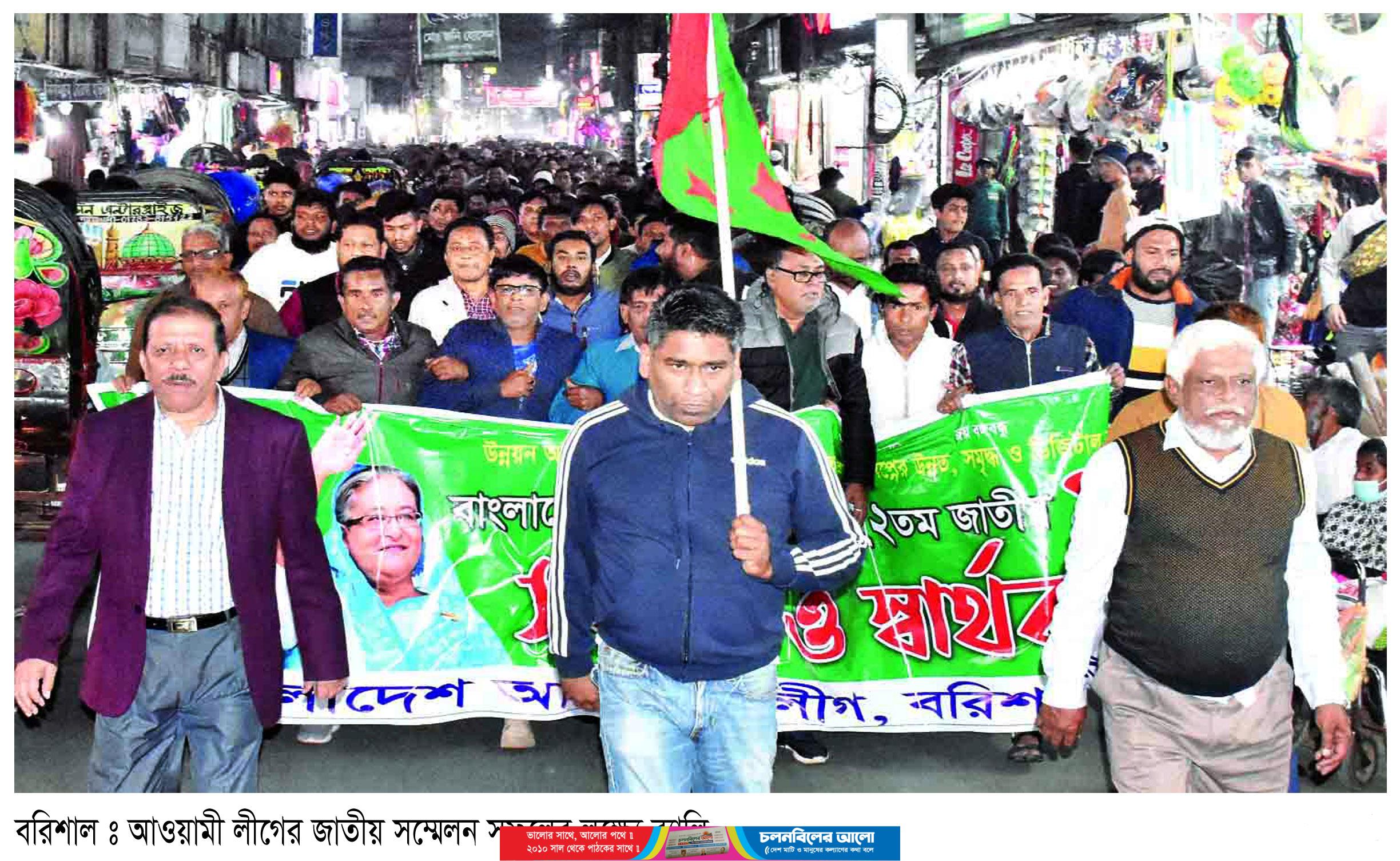 আওয়ামী লীগের ২২ তম জাতীয় সম্মেলন সফল করতে বরিশার নগরীতে র‌্যালি করেছে জেলা ও মহানগর আওয়ামী লীগের নেতাকর্মীরা। বৃহস্পতিবার সন্ধ্যার পরে নগরীর দলীয় কার্যালয়ের সামনে থেকে র‌্যালি বের করা হয়।
