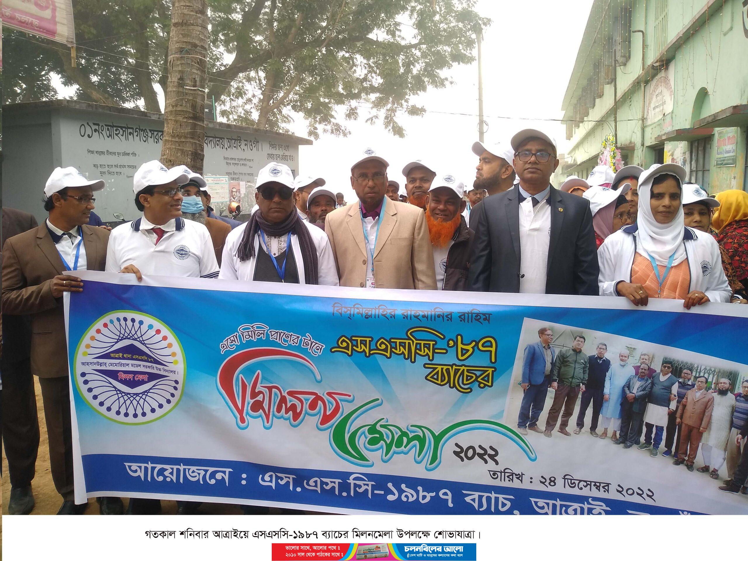 নওগাঁর আত্রাইয়ে এসএসসি ৮৭ ব্যাচের বন্ধুদের আয়োজনে এক মিলন মেলা ২০২২ অনুষ্ঠিত হয়েছে। গতকাল শনিবার সকাল ১০ টা হতে রাত ৮ টা পর্যন্ত,আহসান উল্লাহ্ মেমোরিয়াল মডেল সরকারি উচ্চ বিদ্যালয় ক্যাম্পাসে এক আড়ম্বপূর্ণ অনুষ্ঠানে সভাপতিত্ব করেন আয়োজক কমিটির আহবায়ক প্রভাষক শহিদুল ইসলাম।
