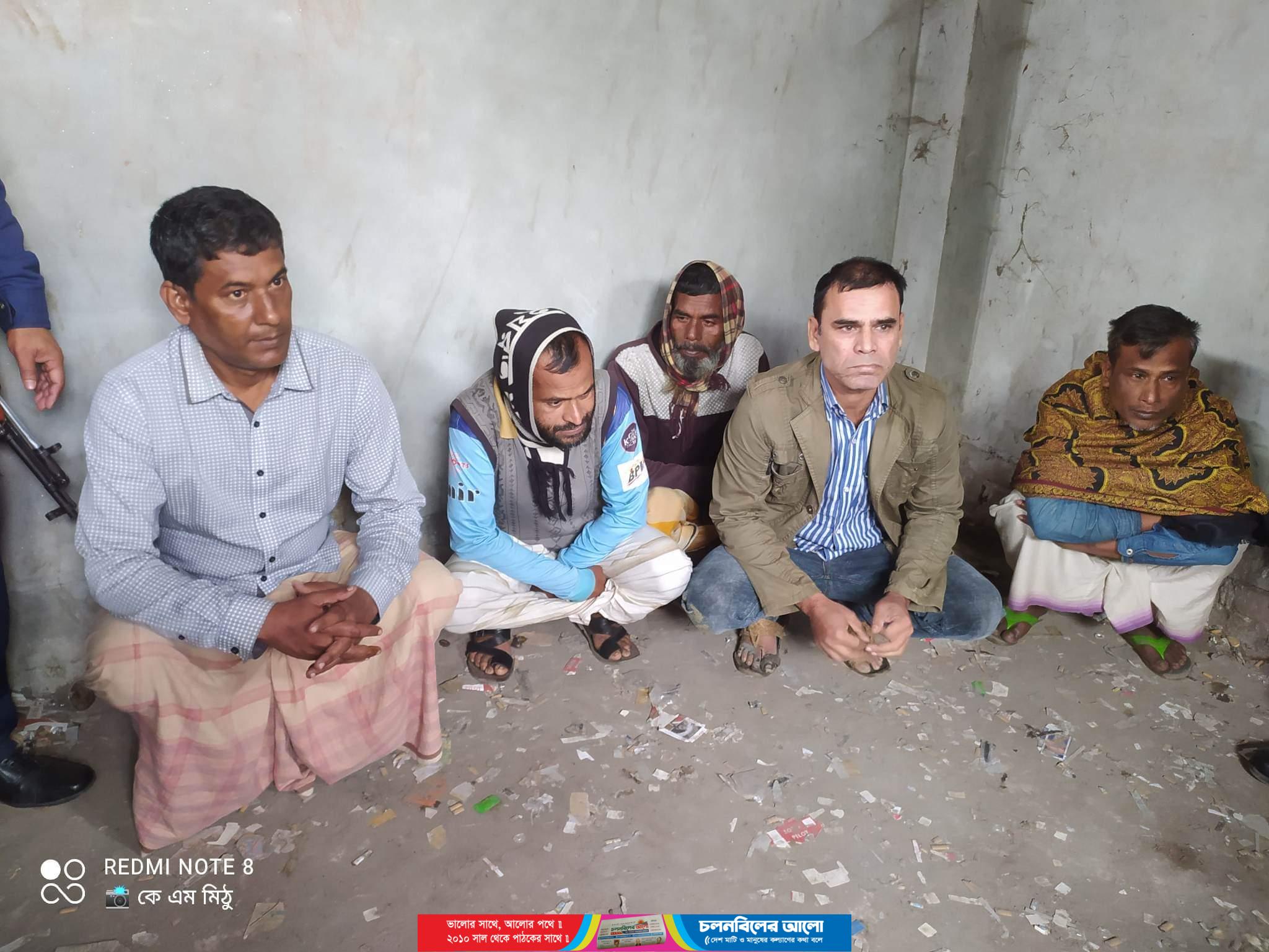 আটককৃতরা হলেন উপজেলার বাণীপাড়া গ্রামের মৃত নুরুল ইসলামের ছেলে মোঃ গিয়াসউদ্দিন (৪৩), মাদারজানী গ্রামের নবাব আলীর ছেলে মো. নাসির (৩৫), উত্তর গোপালপুর গ্রামের মীর আব্দুর রহিমের ছেলে মীর নাজমুল আহসান (৫৫), দক্ষিণ গোপালপুর গ্রামের মো. সোবাহানের ছেলে আঃ মজিদ(৫৫), রামজীবনপুর গ্রামের মো. কিতাব আলীর ছেলে মো. মোশারফ হোসেন (৪২) এবং কোনাবাড়ি বাজার এলাকার আঃ মজিদ তালুকদারের ছেলে মো. সোহেল তালুকদার (৪৫)।