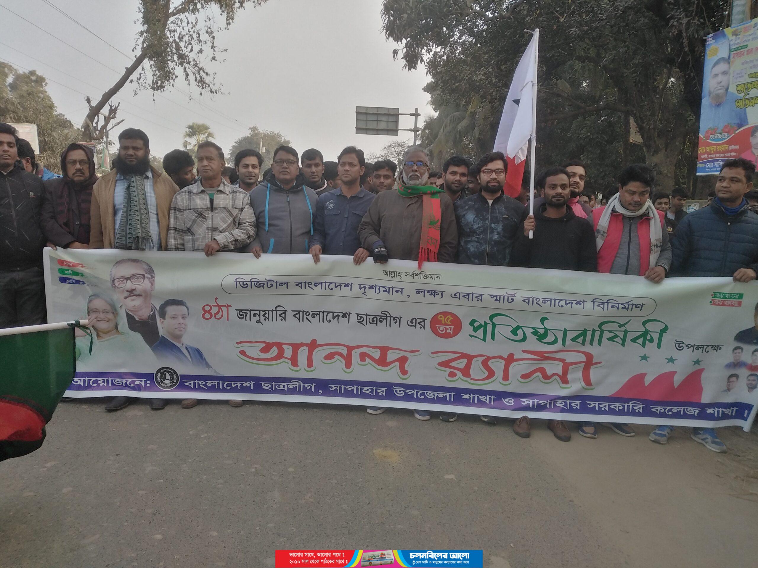 বুধবার বাংলাদেশ ছাত্রলীগের গৌরব, ঐতিহ্য, সংগ্রাম ও সাফল্যের ৭৫ তম প্রতিষ্ঠাবার্ষিকী উপলক্ষ্যে সাপাহার উপজেলা ছাত্রলীগ ও সাপাহার সরকারি কলেজ শাখা ছাত্রলীগের যৌথ আয়োজনে সকাল সাড়ে ৮ টায় দলীয় কার্যালয়ে জাতীয় ও দলীয় পতাকা উত্তোলন এবং বঙ্গবন্ধুর প্রতিকৃতিতে পুষ্পমাল্য অর্পণ,কেক কেটা, পরে বিকেল ৪ টায় র্যালি ও আলোচনা সভার মধ্য দিয়ে বাংলাদেশ ছাত্রলীগ এর ৭৫ তম প্রতিষ্ঠাবার্ষিকী পালন করা হয়েছে।