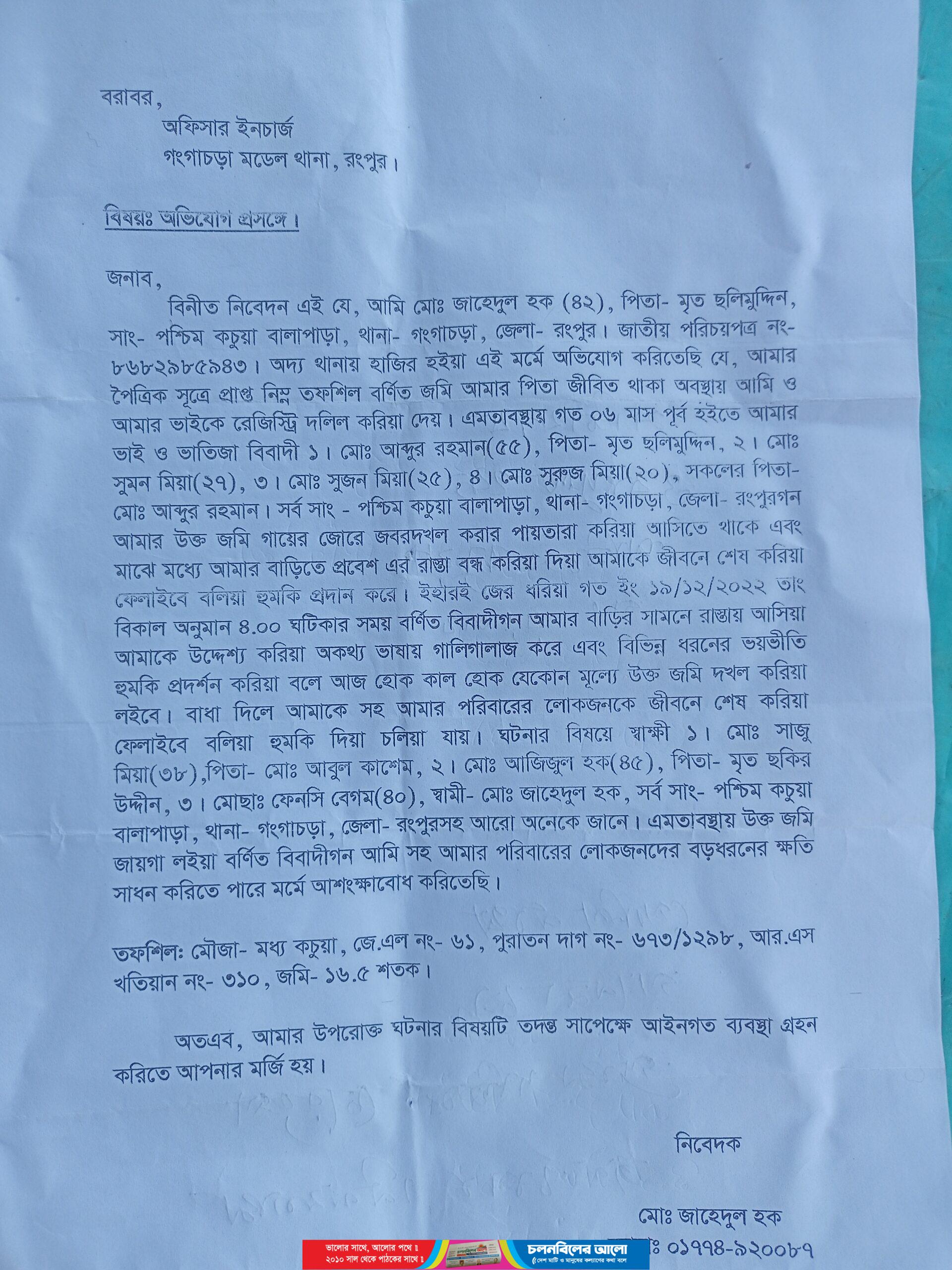 রংপুরের গংগাচড়া উপজেলার নোহালী ইউনিয়নের পশ্চিম কচুয়া বালা পাড়া গ্রামে জোর পূর্বক ছোট ভাই এর জমি দখল করে আছে আপন বড় ভাই। জমির ভাগ চাইতেই প্রাণ নাশের হুমকি দেয় বড় ভাই ও ভাতিজা। ভুক্তভোগী মৃত ছলিমুদ্দিন এর পুত্র জাহেদুল হক জানান, আমার পিতা জীবিত থাকা অবস্থায় আমার বড় ভাই আব্দুর রহমান ও আমাকে রেজিস্ট্রি দলিল করে দেয়। যাহা মধ্য কচুয়া মৌজায় অবস্থিত জেএল নং ৬১, সাবেক দাগ ৬৭৩/১২৯৮,আরএস খতিয়ান ৩১০। কিন্তু আমার বড় ভাই আমাকে আমার আমার হিসাবের অংশ বুঝিয়ে না দিয়ে টালবাহানা করতে থাকে। আমার ভাগের অংশ বুঝিয়ে দিতে বললে আমাকে বড় ভাই ও ভাতিজারা বিভিন্ন হুমকি দিতে থাকে এবং আরো বলে যে রাস্তা ঘাটে যেখানেই পাবে সেখানে প্রাণে মেরে দিবে।