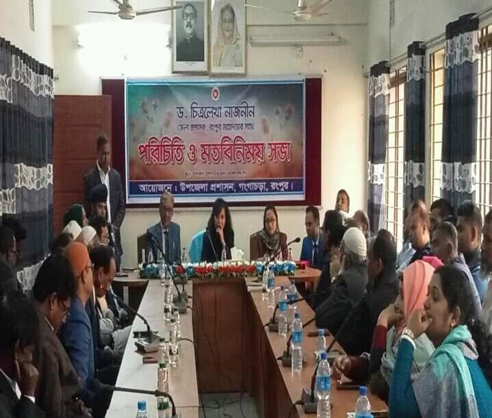 রংপুরের গঙ্গাচড়ায় নবাগত জেলা প্রশাসক ড. চিত্রলেখা নাজনীন এর পরিচিতি ও মতবিনিময় সভা অনুষ্ঠিত হয়েছে। গঙ্গাচড়া উপজেলা পরিষদের সকল কর্মকর্তা, জনপ্রতিনিধি, বীর মুক্তিযোদ্ধা, রাজনৈতিক ব্যক্তিত্ব,সংবাদকর্মী ও সুশীল সমাজের সাথে পরিচিতি ও মতবিনিময় সভার আয়োজন করে গঙ্গাচড়া উপজেলা প্রশাসন। গতকাল মঙ্গলবার দুপুর ১ টায় উপজেলা পরিষদ কনফারেন্স হলরুমে পরিচিতি ও মতবিনিময় সভায় সদ্য যোগদানকৃত রংপুর জেলা প্রশাসক ড.চিত্রলেখা নাজনীন প্রধান অতিথি হিসেবে উপস্থিত ছিলেন। উপজেলা নির্বাহী অফিসার নাহিদ তামান্নার সভাপতিত্বে বিশেষ অতিথি হিসেবে উপস্থিত ছিলেন গঙ্গাচড়া উপজেলা আওয়ামীলীগের সভাপতি ও উপজেলা পরিষদ চেয়ারম্যান আলহাজ্ব রুহুল আমীন। এছাড়া সভায় উপস্থিত ছিলেন উপজেলা ভাইস চেয়ারম্যান মোছাঃ রাবিয়া খাতুন,সাজু মিয়া, উপজেলা সহকারী কমিশননার (ভূমি) নয়ন কুমার সাহা, উপজেলা স্বাস্থ্য ও পরিবার পরিকল্পনা কর্মকর্তা ড.মোঃ আসিফ ফেরদৌস ,বীর মুক্তিযোদ্ধা আজিজুল ইসলাম, উপজেলা আ’লীগ সাধারণ সম্পাদক মোঃ আজিজুল ইসলাম,গঙ্গাচড়া মডেল থানার অফিসার ইনচার্জ মোঃ দুলাল হোসেন, উপজেলা সিনিয়র মৎস্য কর্মকর্তা দীপা রানী বিশ্বাস,সমাজসেবা অফিসার মোঃ মোসাদ্দেকুর রহমান,উপজেলা সমবায় অফিসার মোঃ আফতাবুজ্জামান চয়ন,উপজেলা প্রকল্প বাস্তবায়ন কর্মকতা মো.মুনিমুল হক,উপজেলা প্রকৌশলী মজিদুল ইসলাম ,ইউ’পি চেয়ারম্যান মোঃ মাজহারুল ইসলাম লেবু, জিল্লুর রহমান,আব্দুর রউফ,আশরাফ আলী,আবদুল্লাহ আল হাদী,মোহাইমেনুল ইসলাম মারুফ,প্রমূখ।সভায় নবাগত জেলা প্রশাসক গঙ্গাচড়া উপজেলার সার্বিক উন্নয়ন অগ্রযাত্রায় সকলের ইতিবাচক সহযোগিতা কামনা করেন। জনপ্রতিনিধি ও সাংবাদিকরা বিভিন্ন সমস্যা তুরে ধরেন যেমন কিশোরগ্যাং,বাল্যবিয়ে প্রতিরোধ, মাদক নির্মূল,ভেজাল খাদ্য রোদ,দ্রব্যমূল্যের উর্ধগতি সহ সরকারি কর্মকর্তা-কর্মচারিদের জবাবদিহিতার আওতায় আনার পরামর্শ দেন। এসময় প্রশাসন কনফারেন্স হলরুমে জায়গা সংকটের কারণে আলোচনা সভার শুরুতে উপজেলা প্রশাসনের বিভিন্ন দপ্তরের কর্মকর্তা, ইউ’পি জনপ্রতিনিধি, ও গনমাধ্যমকর্মীদের নির্দিষ্ট বসার জায়গা না থাকায় অনেকেই দাড়িয়ে থাকেন এবং অনেক দপ্তরের কর্মকর্তারা রুম থেকে বেরিয়ে এসে উপজেলা নির্বাহী অফিসারের রুমে অবস্থান করেন। বসার জায়গা সংকট বিষয়ে উপজেলা নির্বাহী কর্মকর্তা বলেন বিষয়টি প্রশাসনের নজরে এসেছে পরবর্তীতে এধরণের ঘটনা যাতে নাহয় তিনি আশ্বাস প্রদান করেন ।
