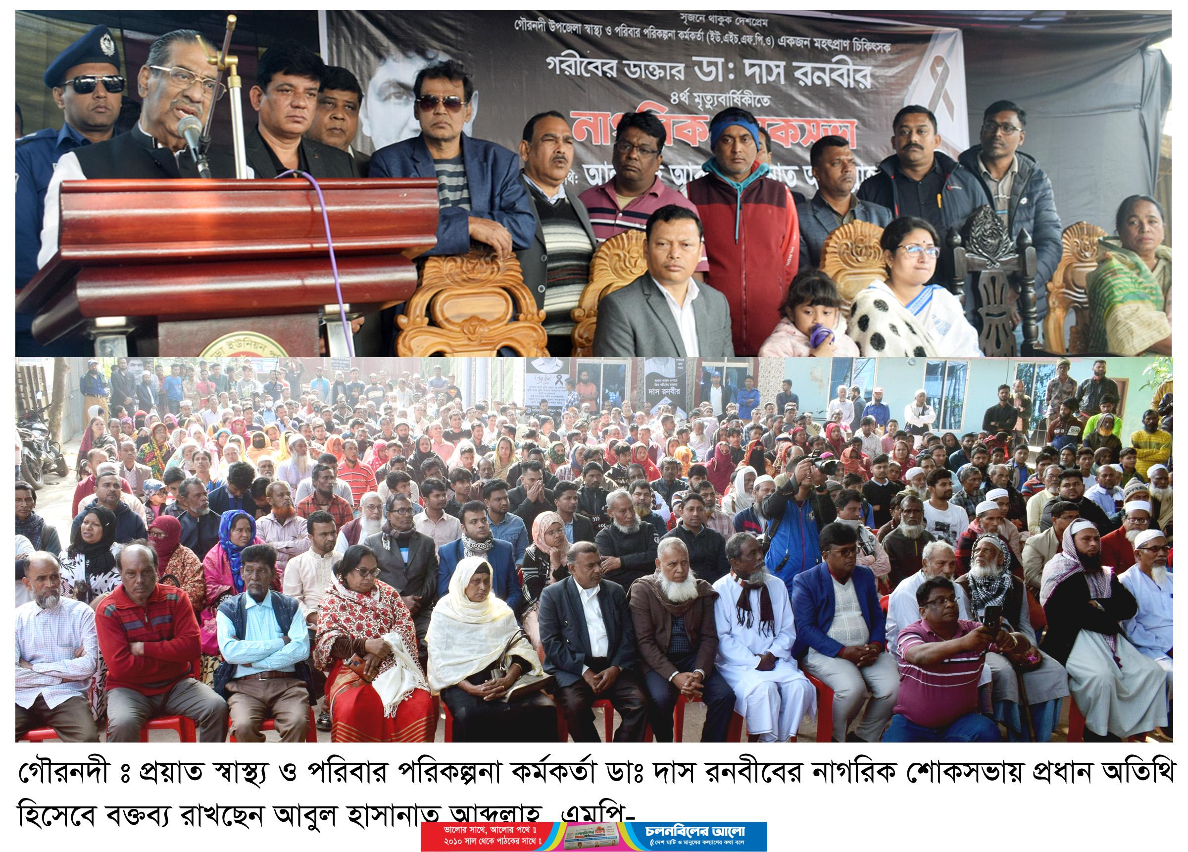 প্রয়াত চিকিৎসকের স্মরনে তিনি বলেন, ডাঃ দাস রনবীর ছিলেন একজন মহৎপ্রান চিকিৎসক। তিনি আমৃত্যু বিনামূল্যে মানব সেবা করে এ অঞ্চলের গণমানুষের মাঝে অমর হয়ে আছেন। মাহিলাড়া ইউনিয়ন পরিষদের আয়োজনে জাতীয় পুরস্কারপ্রাপ্ত ইউপি চেয়ারম্যান সৈকত গুহ পিকলুর সভাপতিত্বে ও ইউপি সদস্য মিজানুর রহমানের সঞ্চালনায় স্মরণ সভায় অন্যান্যদের মধ্যে বক্তব্য রাখেন উপজেলা চেয়ারম্যান সৈয়দা মনিরুন নাহার মেরী, উপজেলা নির্বাহী অফিসার বিপিন চন্দ্র বিশ্বাস, সাবেক ইউপি চেয়ারম্যান বীর মুক্তিযোদ্ধা কালিয়া দমন গুহ, ইউনিয়ন আওয়ামী লীগের সভাপতি আলমগীর হোসেন কবিরাজ, বীর মুক্তিযোদ্ধা হারুন অর রশিদ, প্রয়াত চিকিৎসকের সহধর্মীনি জয়িতা রায় তমা। সভা শুরুর আগে রনবীরের ম্যুরালে ফুলের শ্রদ্ধা নিবেদন করা হয়।