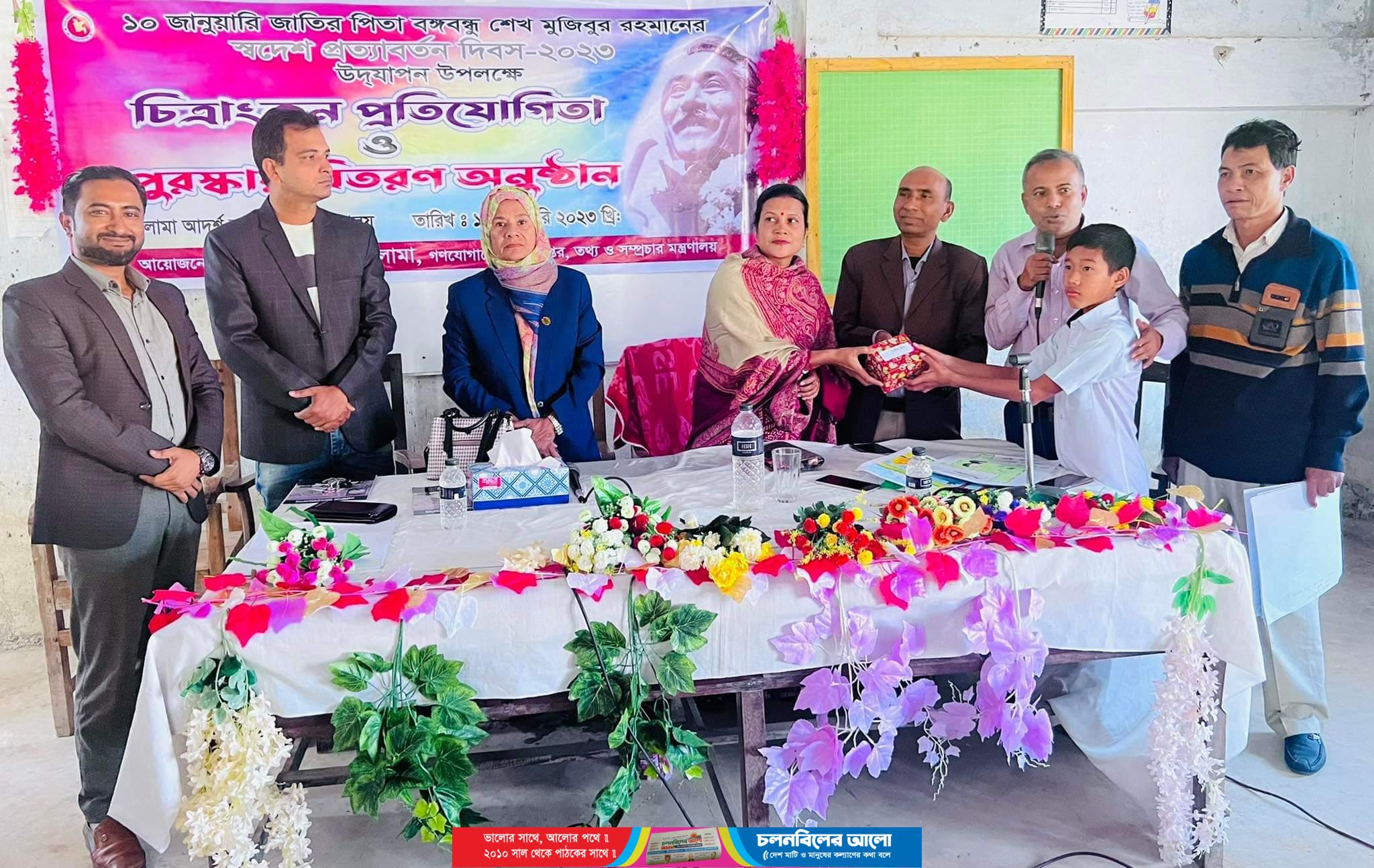 তথ্য অফিস লামার আয়োজনে ১২ জানুয়ারি লামা আদর্শ বালিকা উচ্চ বিদ্যালয়ে জাতির পিতা বঙ্গবন্ধু শেখ মুজিবুর রহমানের স্বদেশ প্রত্যাবর্তন দিবস উদযাপন উপলক্ষে চিত্রাংকন প্রতিযোগিতা ও বিজয়ীদের মাঝে পুরস্কার বিতরণ অনুষ্ঠিত হয়।বৃহস্পতিবার (১২জানুয়ারি, ২০২৩ ইং) সকাল ১০ ঘটিকায় তথ্য অফিস লামার সহকারি তথ্য অফিসার খন্দকার তৌহিদের সভাপতিত্বে গনযোগাযোগ অধিদপ্তরের পরিচালক ( প্রচার ও সমন্বয়) হাসিনা আক্তার ভিডিও কলে সংযুক্ত হয়ে অনুষ্ঠানের উদ্বোধন ঘোষণাসহ দিবসের তাৎপর্য তুলে ধরে প্রধান অতিথির বক্তব্য রাখেন ।