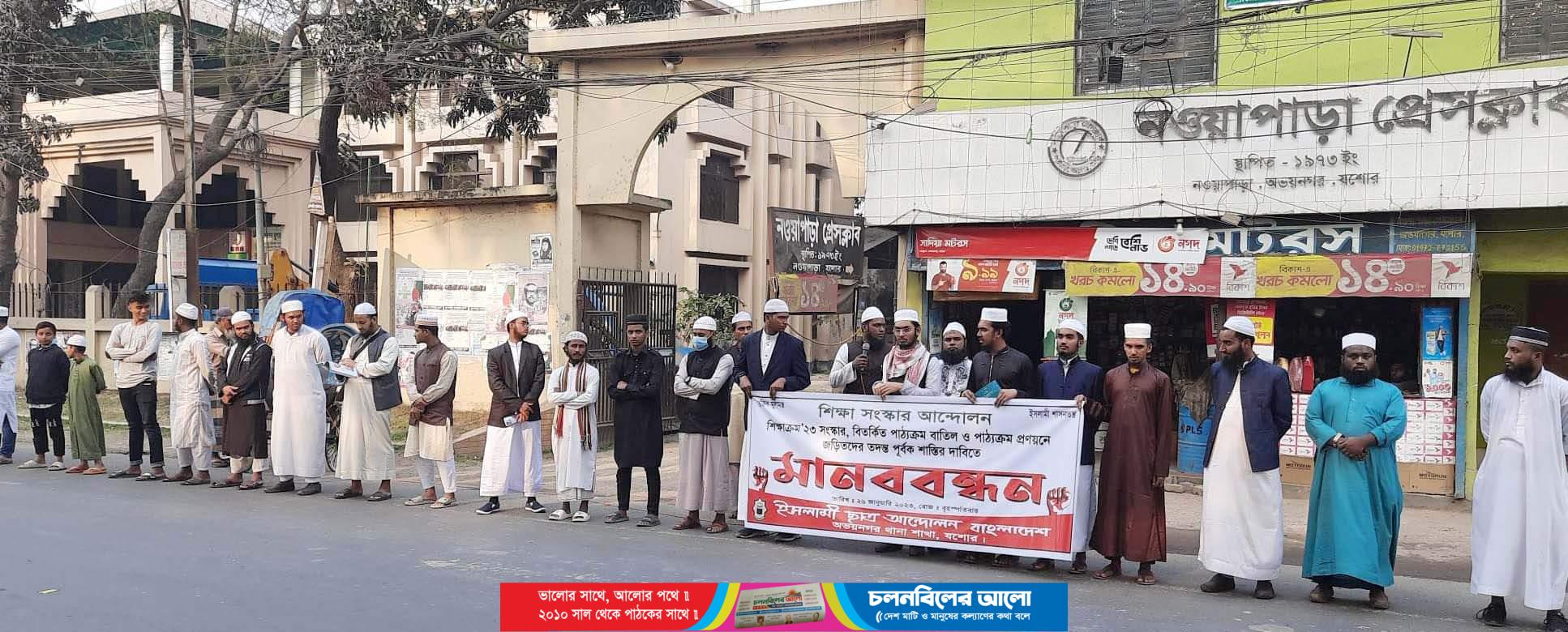 বিতর্কিত পাঠ্যক্রম বাতিল ও পাঠ্যক্রম প্রণয়নে জড়িতদের শাস্তির দাবিতে যশোরের অভয়নগরে মানবন্ধন অনুষ্ঠিত হয়েছে। ইসলামী ছাত্র আন্দোলন বাংলাদেশ অভয়নগর উপজেলা শাখা এ মানববন্ধনের আয়োজন করে। বৃহস্পতিবার (২৬ জানুয়ারি) বিকালে নওয়াপাড়া প্রেস ক্লাবের সামনে মাদরাসা ছাত্ররা এ মানববন্ধনে অংশগ্রহণ করে। ঘন্টাব্যাপী চলা মানববন্ধনে বক্তব্য রাখেন, ইসলামী ছাত্র আন্দোলন যশোর জেলা শাখার সাধারণ সম্পাদক ফয়েজ গাজী, অভয়নগর উপজেলা শাখার সভাপতি ওহিদুল ইসলাম, সহ-সভাপতি তাওহিদুল ইসলাম ও সাবেক সভাপতি আশরাফুল ইসলাম। এসময় ২০২৩ শিক্ষাক্রমে বিতর্কিত পাঠ্যক্রম বাতিল ও পাঠ্যক্রম প্রণয়নে জািড়তদের তদন্তপূর্বক শস্তির দাবি করেন বক্তারা। অন্যথায় কঠোর আন্দোলনের মধ্যদিয়ে সরকার পতনের হুশিয়ারী প্রদান করেন তারা। মানববন্ধন শেষে দোয়া অনুষ্ঠিত হয়। পরে ইসলামী ছাত্র আন্দোলনের প্রতিনিধি দল উপজেলা মাধ্যমিক শিক্ষা কর্মকর্তা শহিদুল ইসলাম বরাবর স্মারকলিপি প্রদান করে।