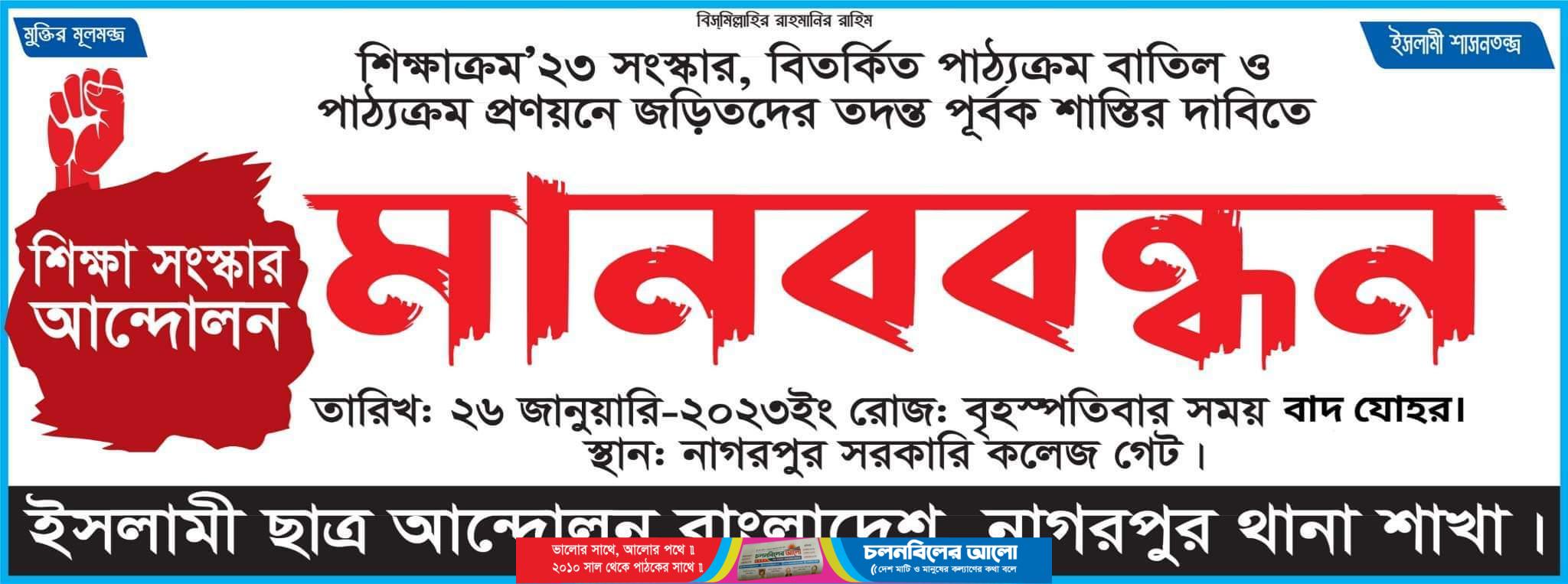 নাগরপুরে ইসলামী ছাত্র আন্দোলন বাংলাদেশ এর উদ্যোগে শিক্ষাক্রম ২০২৩ সংস্কার,বিতর্কিত পাঠ্যক্রম বাতিল ও পাঠ্যক্রম প্রণয়নে জড়িতদের তদন্ত পূর্বক শাস্তির দাবিতে কেন্দ্রীয় কর্মসূচি’র অংশ হিসেবে বৃহস্পতিবার ২৬ জানুয়ারি, ২০২৩ বাদ যোহর নাগরপুর সরকারি কলেজ গেটের সামনে ঘন্টাব্যাপী মানববন্ধন অনুষ্ঠিত হয়।