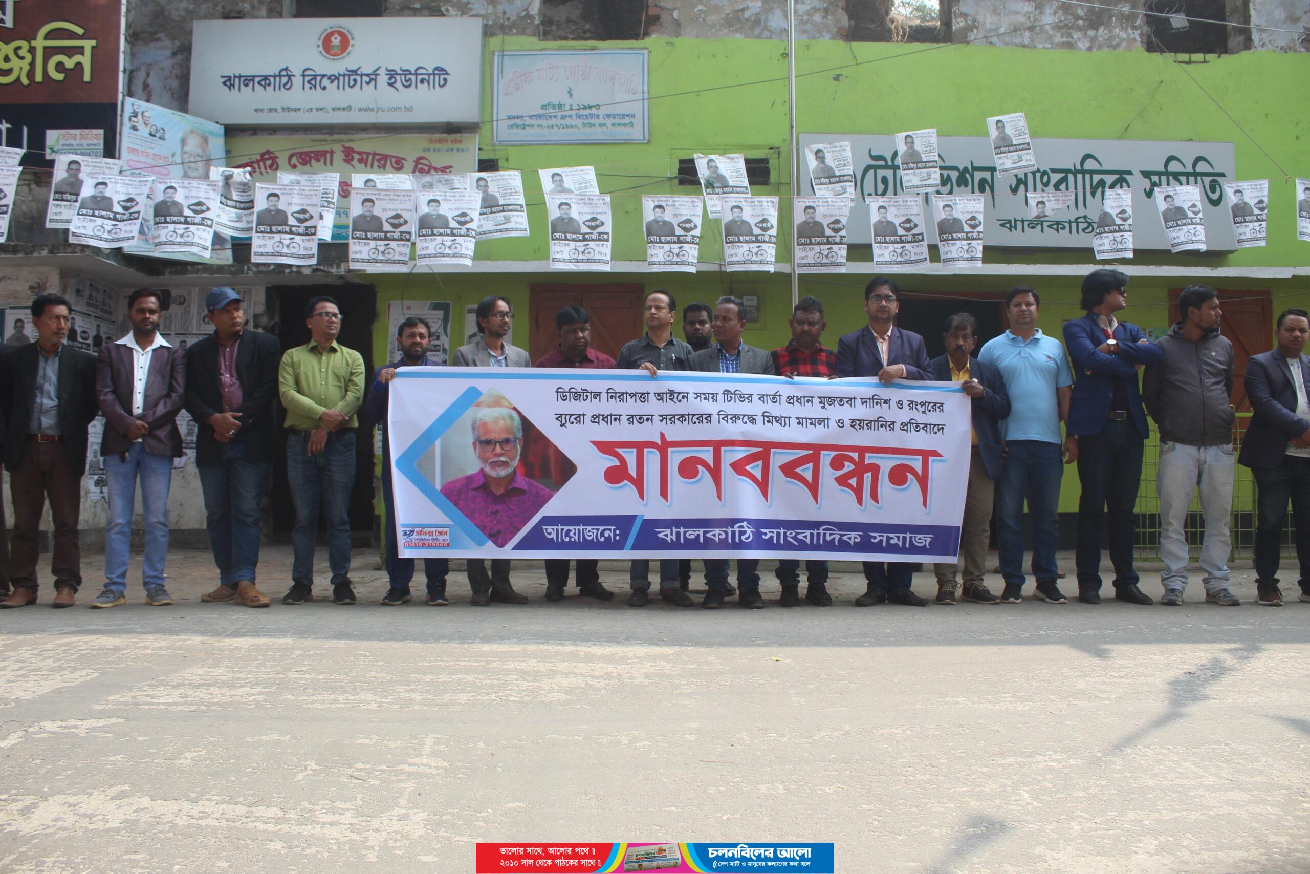 সময় টেলিভিশনের বার্তা প্রধান মুজতবা দানিশ ও রংপুর ব্যুারো প্রধান রতন সরকারকে ডিজিটাল নিরাপত্তা আইনের মামলায় হয়রানীর প্রতিবাদে এবং কালো আইন বাতিলের দাবীতে ঝালকাঠি মানববন্ধন করেছেন কর্মরত সাংবাদিকরা। বৃহস্পতিবার বেলা ১১টায় সাংবাদিক সমাজের ব্যানারে স্থানীয় টেলিভিশন সাংবাদিক সমিতির সামনে এ কর্মসূচি পালিত হয়।