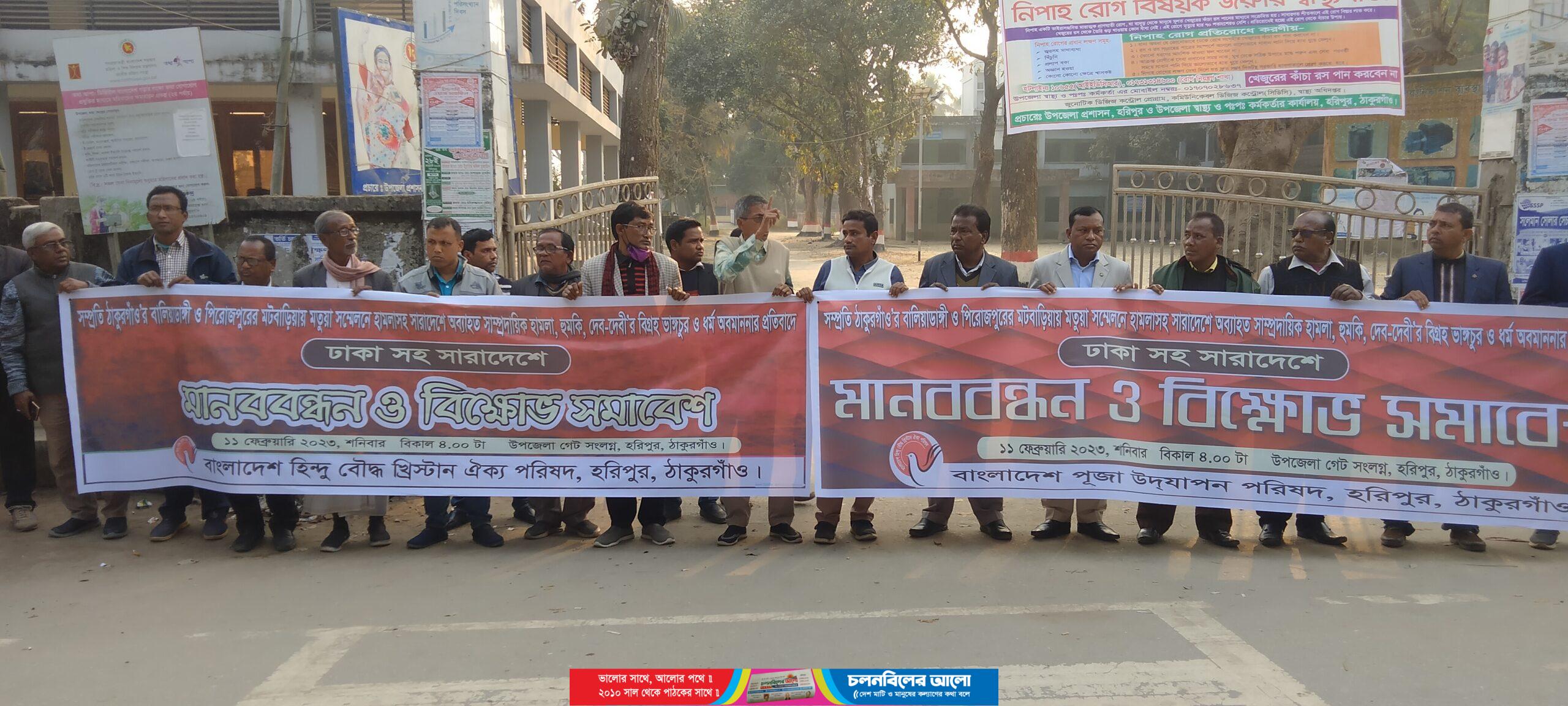 হরিপুরে হিন্দু -বৌদ্ধ খ্রিষ্ঠান ঐক্য পরিষদের মানবন্ধন ও বিক্ষোভ সমাবেশ অনুষ্ঠিত