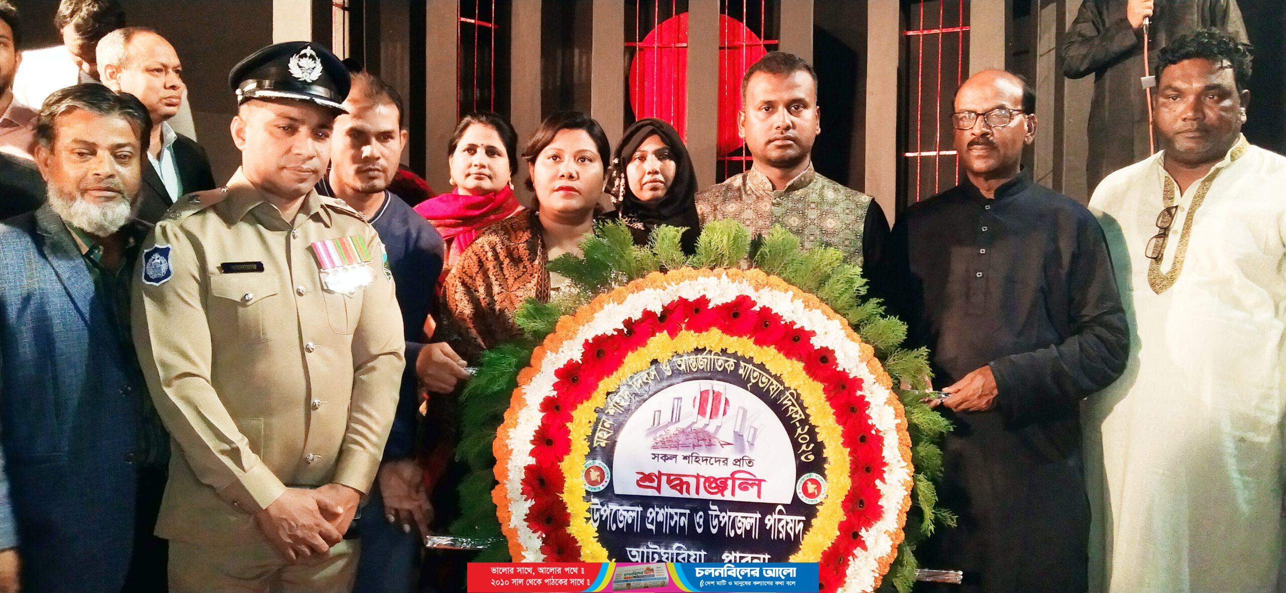 এদিবসটি উপলক্ষে ২১’শে ফেব্রয়ারি রাত ১২ টা ১ মিনিটে ভাষা শহীদদের স্মরণে উপজেলার কেন্দ্রীয় শহীদ মিনারে পুষ্পস্তবক অর্পণ করে শ্রদ্ধা জানান উপজেলা নির্বাহী অফিসার মাকসুদা আক্তার মাসু, আটঘরিয়া উপজেলা চেয়ারম্যান তানভীর ইসলাম, উপজেলা আওয়ামী লীগের সভাপতি ও মেয়র শহিদুল ইসলাম রতন,